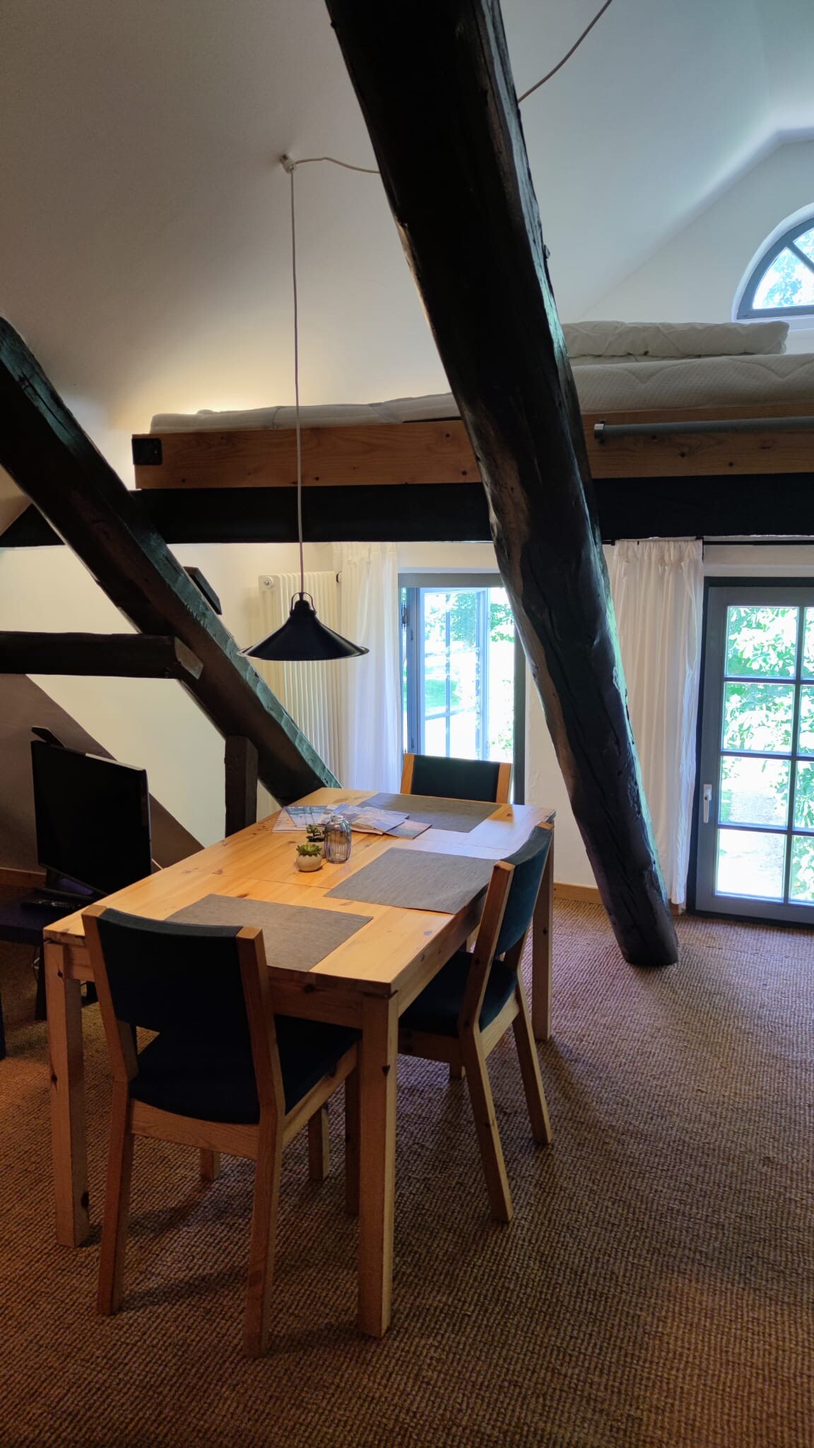 Besondere Loft-Ferienwohnung im Industriedenkmal "Alte Meierei" am Ortsrand von Tating. Offene Galerie mit Doppelbett, separates Kinderzimmer mit 2 Betten, stylischer Wohnbereich mit moderner Küche. Große Fenster, Garten- und Terrassennutzung inklusive. Perfekt für Paare und Familien mit Sinn für Architektur und Atmosphäre.