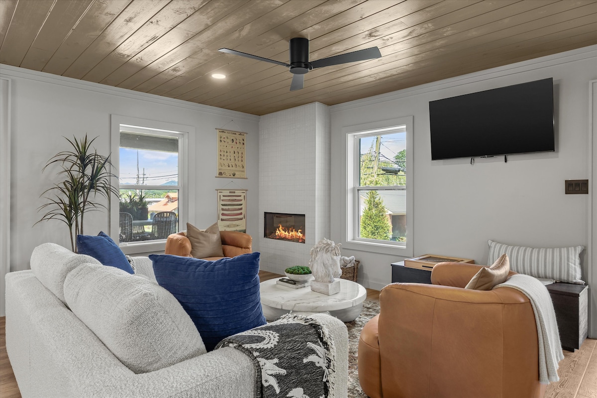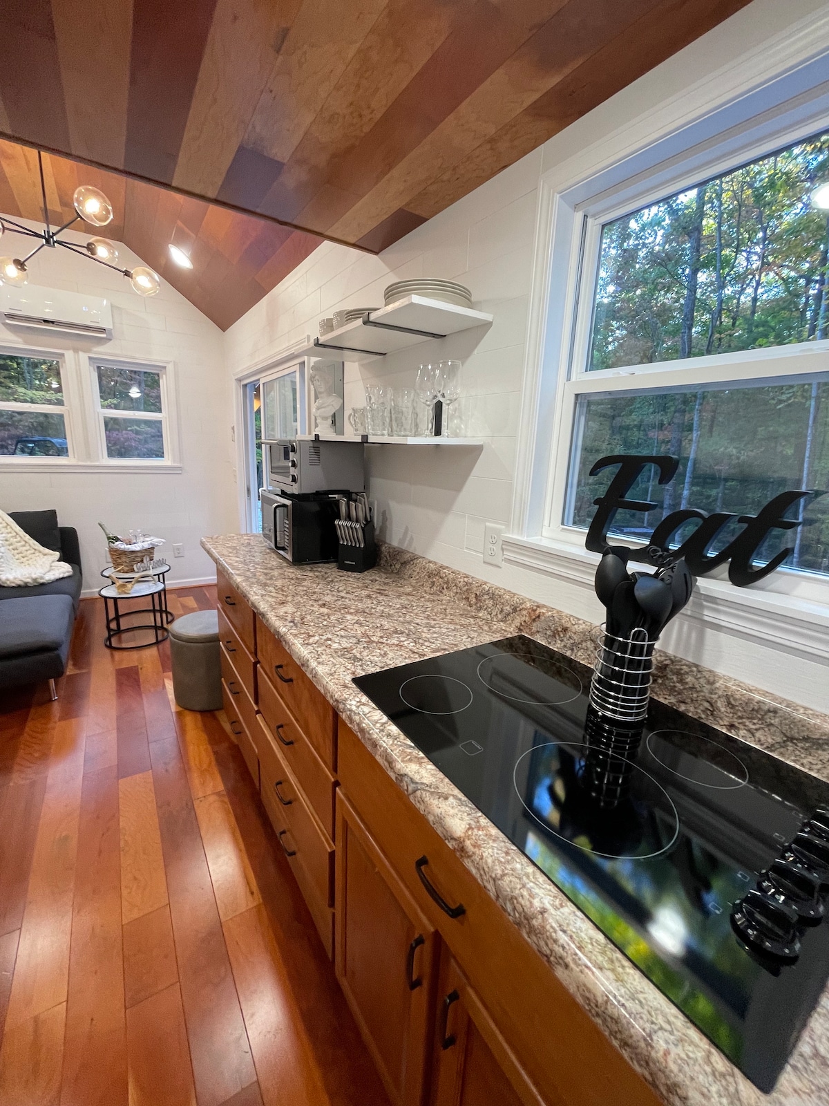 Escape to a luxury tiny home featuring a unique treehouse-style bedroom, set on 34 private acres bordering the Cherokee National Forest. Step outside to a spacious covered outdoor living area with a 14-foot stone fireplace and a private hot tub surrounded by peaceful forest views. Thoughtfully designed for comfort and relaxation, the home includes upgraded linens, soft robes, complimentary champagne, coffee, water, and curated snacks to make your stay feel effortless and elevated.