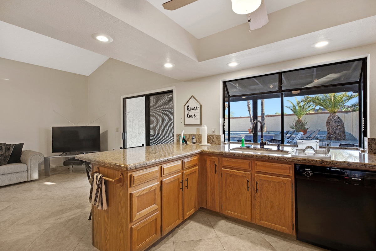 Ngắm bình minh và hoàng hôn tại La Donna Lane! Trải nghiệm ngôi nhà 4 phòng ngủ sáng sủa và thoáng mát, 2 phòng tắm với hồ bơi nước mặn, sân hiên có mái che khổng lồ và phòng bàn bi-a! Ngôi nhà rộng lớn và thân thiện của chúng tôi đang chờ đón gia đình và bạn bè đến tận hưởng ánh nắng mặt trời ở Arizona! Đây là một nơi hoàn hảo để một nhóm lớn tụ tập và thư giãn. Hệ thống sưởi hồ bơi (trung bình 83 độ) có sẵn từ tháng 11 - tháng 3 với một khoản phí! Vui lòng hỏi! Vui lòng hỏi về việc nhận phòng sớm và trả phòng muộn!