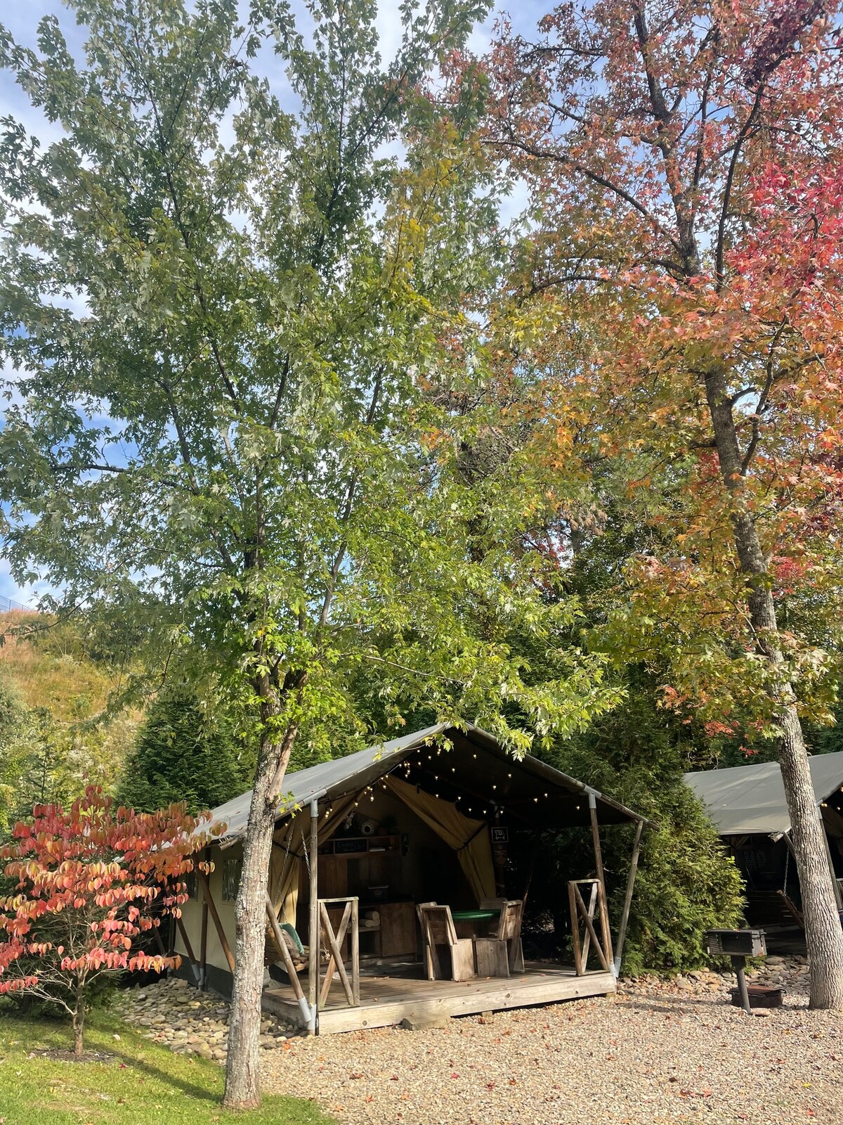 Hãy đến ở trong lều cắm trại thủ công của chúng tôi, được xây dựng bằng đồ mộc khung gỗ truyền thống và được bọc trong vẻ đẹp và kỳ lạ của vải cotton thoáng khí. Hít vào. Đến gần. Hãy im lặng. Ngắm sương mù buổi sáng bay qua thung lũng từ hiên trước nhà bạn. Ngủ trưa khi ánh sáng mặt trời nhảy múa trên vải bạt. Đắm mình trong âm thanh của tiếng chim hót và gió trong khi đọc một cuốn sách hay. Các chuyến phiêu lưu gần đó: 15 phút – Công viên Mtn. Ấn Độ 40 phút – Hồ Norris 45 phút – Thác Cumberland 2 giờ – Great Smoky Mtn. Ntl. Park
