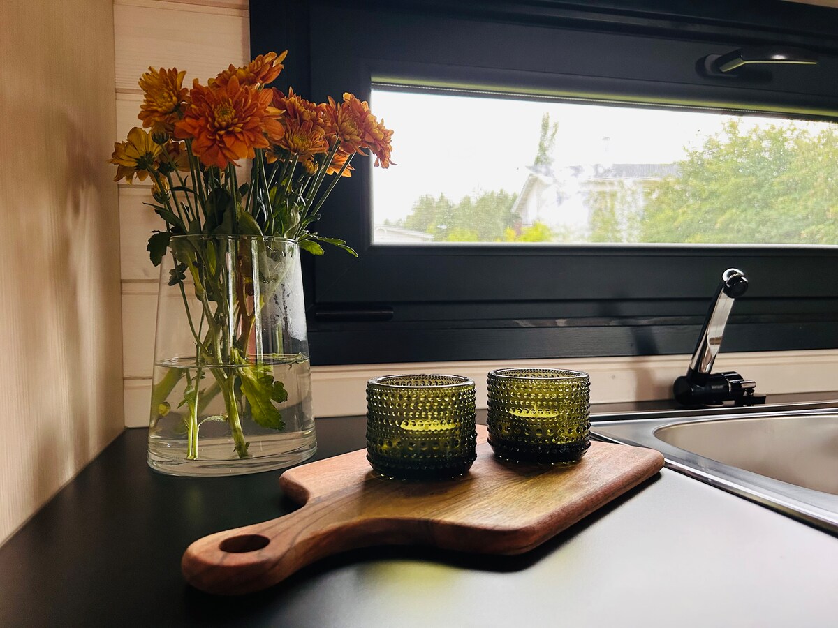 Nhà nghỉ thôn dã xông hơi khí quyển (22m²) ở vùng nông thôn. Thoát khỏi cuộc sống hàng ngày, tận hưởng sự yên bình và tĩnh lặng của một ngôi nhà nghỉ thôn dã nằm trong sân nhà của chúng tôi, nhưng hoàn toàn trong sự yên bình của riêng bạn. Một chiếc giường rộng 160 cm thoải mái cung cấp không gian cho hai người lớn. Hâm nóng phòng xông hơi đốt củi của riêng bạn, thư giãn trên sân thượng hoặc bên đống lửa trại trên laavu. Ngắm nhìn bầu trời đầy sao hoặc ánh đèn phía Bắc cách xa ánh đèn thành phố. Vào một buổi sáng mùa đông, bạn có thể đi bộ trên những con đường mòn trong rừng tuyết tuyệt đẹp, lắng nghe sự yên tĩnh của thiên nhiên và hít thở không khí trong lành.