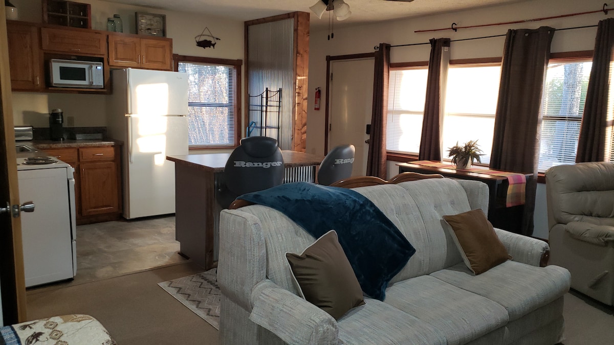 Cabin gỗ được trang bị đầy đủ sẽ ngủ thoải mái từ 5 đến 6 người lớn với một giường queen và ba giường đơn. Tiện nghi bổ sung bao gồm: tủ lạnh đầy đủ, bếp mới, lò vi sóng, ấm cà phê, máy giặt/máy sấy và TV nhỏ. Có phòng tắm đầy đủ ở tầng dưới với vòi sen và bồn tắm. Cabin nằm trong một trang trại làm việc được bao quanh bởi rừng và đồng cỏ với các khu ẩm thực và ao động vật hoang dã. Đây là một nơi tuyệt vời để đi xe 4 bánh. Chúng tôi ở rất gần 2 con sông rất thích hợp để chèo thuyền kayak.