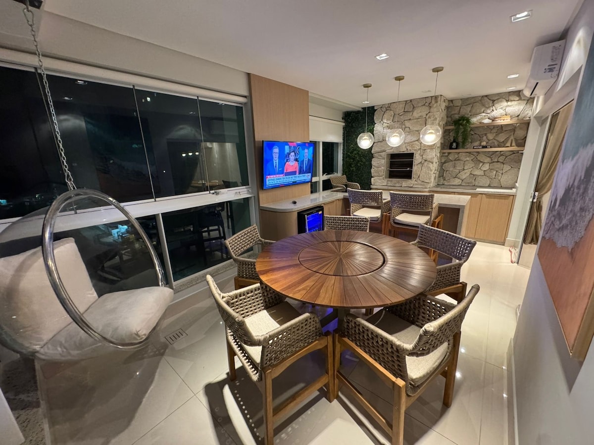 Divirta-se com toda a família neste lugar cheio de estilo. São 2 suítes, 2 vagas de garagem, sacada integrada com churrasqueira, Smartv na sacada com YouTube premium, Netflix, cervejeira, bebedouro, ar condicionado na sala e nos dois quartos, máquina lava e seca, Smartv de 65 na sala com YouTube premium, Netflix. Chuveiros a gás e água quente nas torneiras, cadeira de praia, guarda sol, Tudo isso a 400 metros do mar da praia que mais valoriza do Brasil.