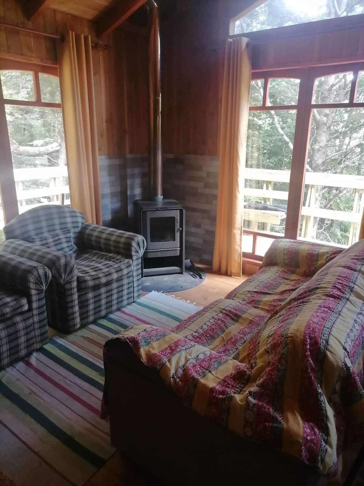Duplex for 2. 7 mts above ground. 2 acre private park. Decks with panoramic views to infinity and a hanging bridge to let your dreams fly. Thermal insulation, double glass windows, floor heating and slow combustion fireplace. Queen size bed. Desk, Wi-Fi, full kitchen with fridge, induction top and all the necessary utensils to enjoy the stay. Full bath with a shower with amazing view, towels, hair dryer, bidet!, fire pit, bbq and parking. 6 kms from Pucón on paved road. Ran by its owners.