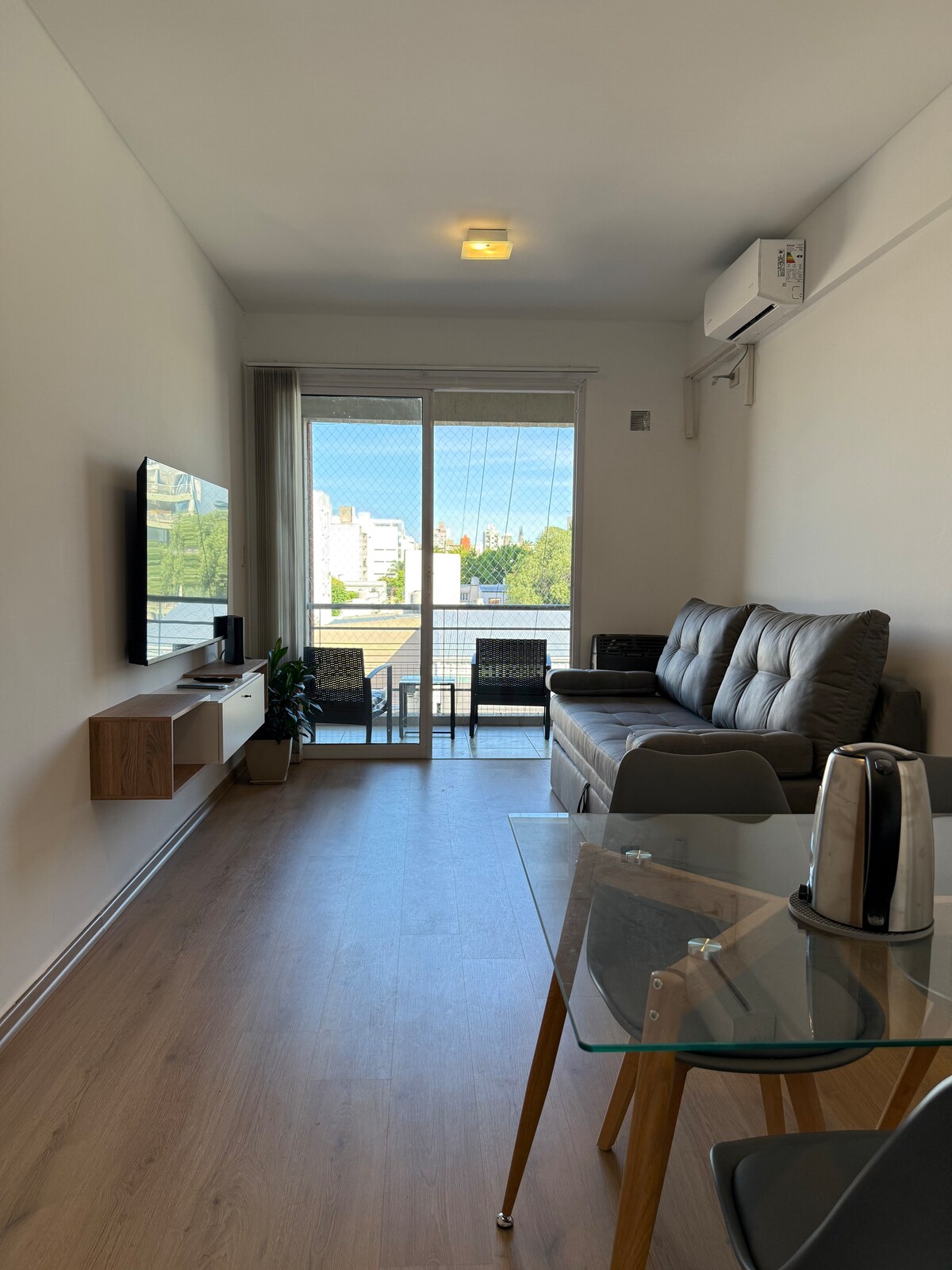 Super bright loft that blends calm and design just two blocks from Hospital Español in La Plata and 10 minutes from Estadio Único Stadium. Air conditioning (hot/cold), 114 Mbps Wi-Fi, fully equipped. On the main floor: double-height living and dining area with coffee/tea station, stylish bathroom with shower, fully equipped kitchen, and a spacious balcony overlooking a green courtyard. Upstairs: bright workspace with plenty of natural light, queen-size bed, large closet, and TV with Netflix.