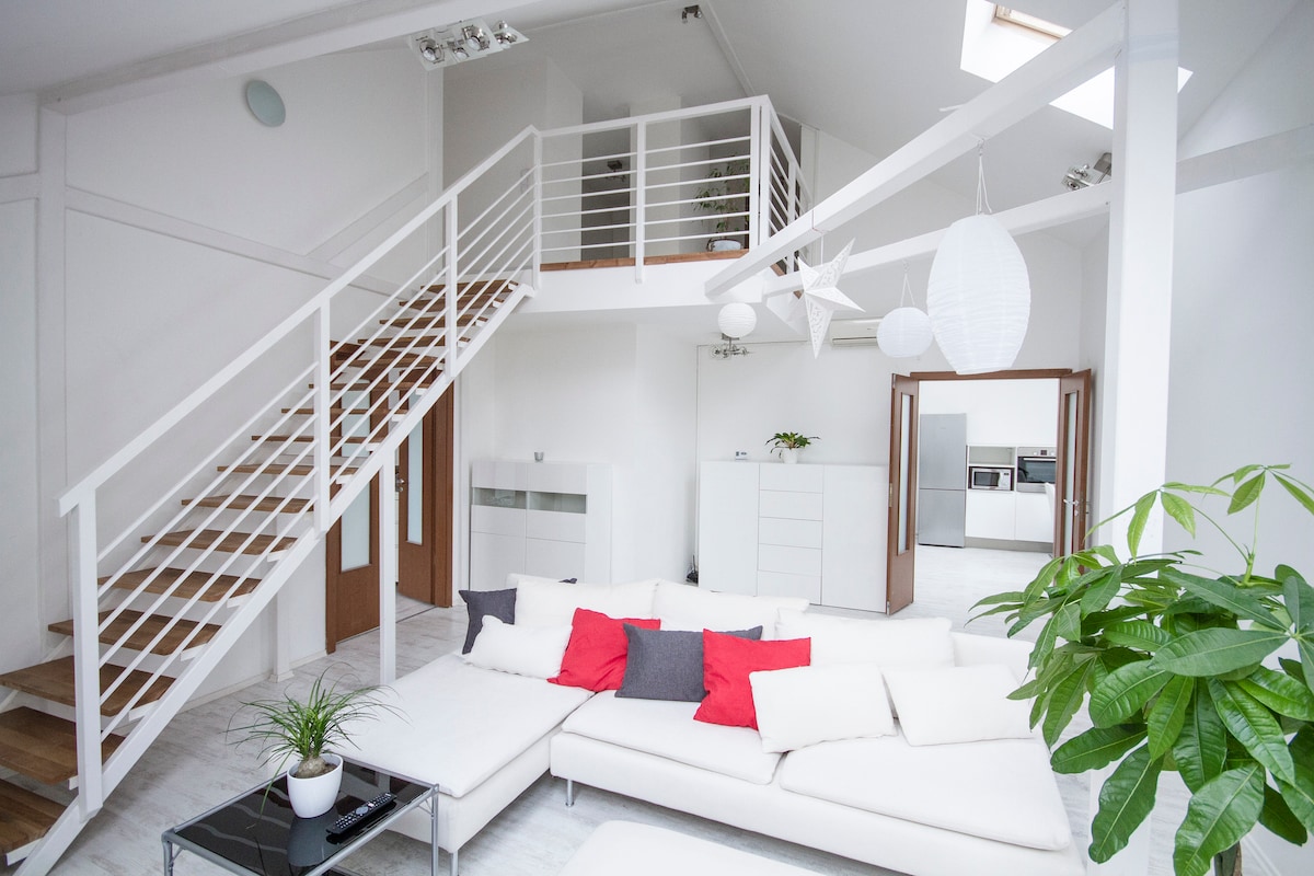 Căn hộ mang phong cách đô thị mới được cải tạo ở tầng trên cùng trong tòa nhà cao nhất nên có tầm nhìn toàn cảnh. Tráng lớn 160x200. Phòng ngủ của khách là một phòng ngủ nhỏ nhưng với nệm lớn thoải mái 180x200. Trong trường hợp khách thứ 5 và thứ 6, chúng tôi có sofa giường 140x200. Sân thượng tầng dưới có thể mở cửa với một nhà bếp trong thời tiết đẹp hoặc trong thời tiết lạnh cũng có thể sử dụng được vì có một máy sưởi lớn. Căn gác có đầy đủ sách phong cách, TV táo, hệ thống âm thanh và ứng dụng nhà thông minh. Chúc bạn có một kỳ nghỉ vui vẻ!
