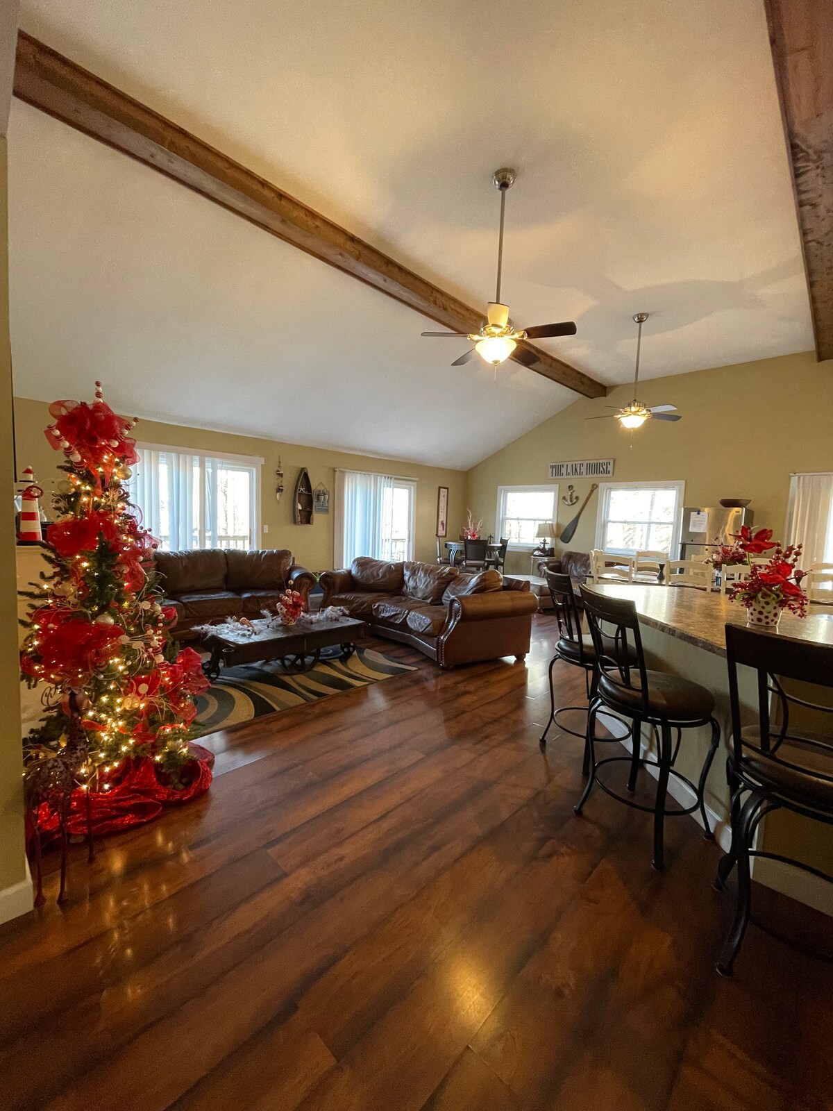 Our Lakehouse is perfect for families. It has 5 bedrooms, 4 queen rooms, 1 bunk room that sleeps 6. The home is perfectly split with two bedrooms, 1 bath and family room upstairs and additional 3 bedrooms, 1 bath with extra family room downstairs. Screened in patio overlooking lake view with TV. Large, partially covered deck with steps that lead down to the dock. Large fire pit area for smores, extra outdoor sectional with fire pit table for lounging. Inquire about pontoon rental availability.