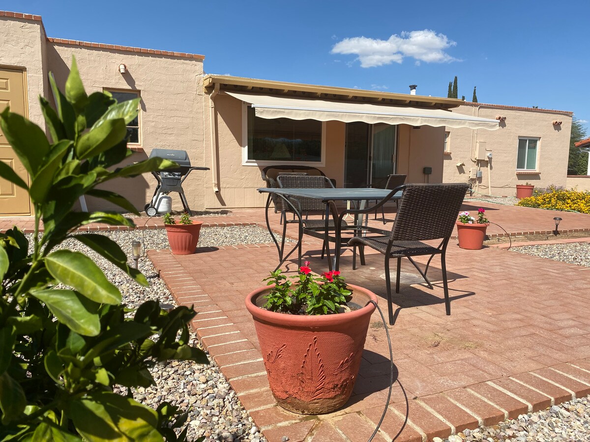 A true Oasis with Private pool, hot spa, grill, outdoor fire pits and indoor wood fireplace. 10 mins drive to shopping center, golf courses, movie theater, restaurants and casino. View of Madera Canyon. 20 mins from airport and Tucson. 30 mins from Tubac. Great for relaxing or entertaining small groups. Perfect for couples, solo adventurers, business travelers and families. Bright and open floor plan with solid brick masonry construction. Walking distance from Anamax Park.