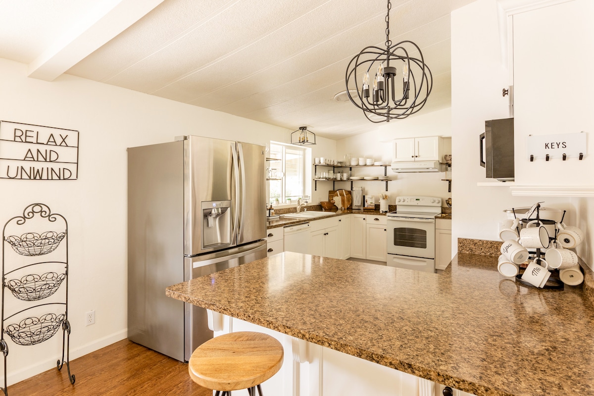 Yên bình, Hồ bơi, Công viên quốc gia! Một ngôi nhà một tầng ở thị trấn quyến rũ nhất trong thung lũng. Lối vào phía nam Sequoia chỉ cách 28 dặm. Tham quan Hồ Kaweah, Công viên quốc gia Three Rivers & Kings Canyon và Big Stump Trail Loop. Khu vườn yên bình, sân hiên và hồ bơi có mái che. Một nhà bếp đầy đủ tiện nghi: mọi thứ, từ máy làm bánh quế cho đến bình pha cà phê kiểu Pháp. TV thông minh và những vì sao trên bầu trời vào ban đêm. Siêu thị, cửa hàng Vintage, cửa hàng bánh quy yêu thích của chúng tôi, quán cà phê, nhà hàng Mexico và Pháp đều cách đó 5 phút!