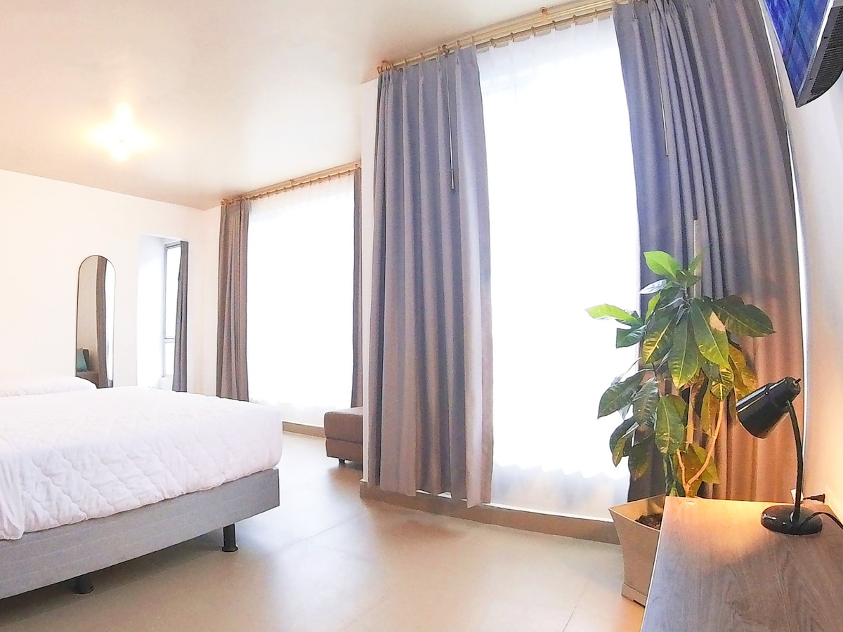 Una suite hermosa amoblada y com todas las comodidades , dormitorio , sala para una persona más , cocina , baño , patio hermoso , todo privado , la vista la amarás , el volcán y las luces de la ciudad en la noche son de ensueño !