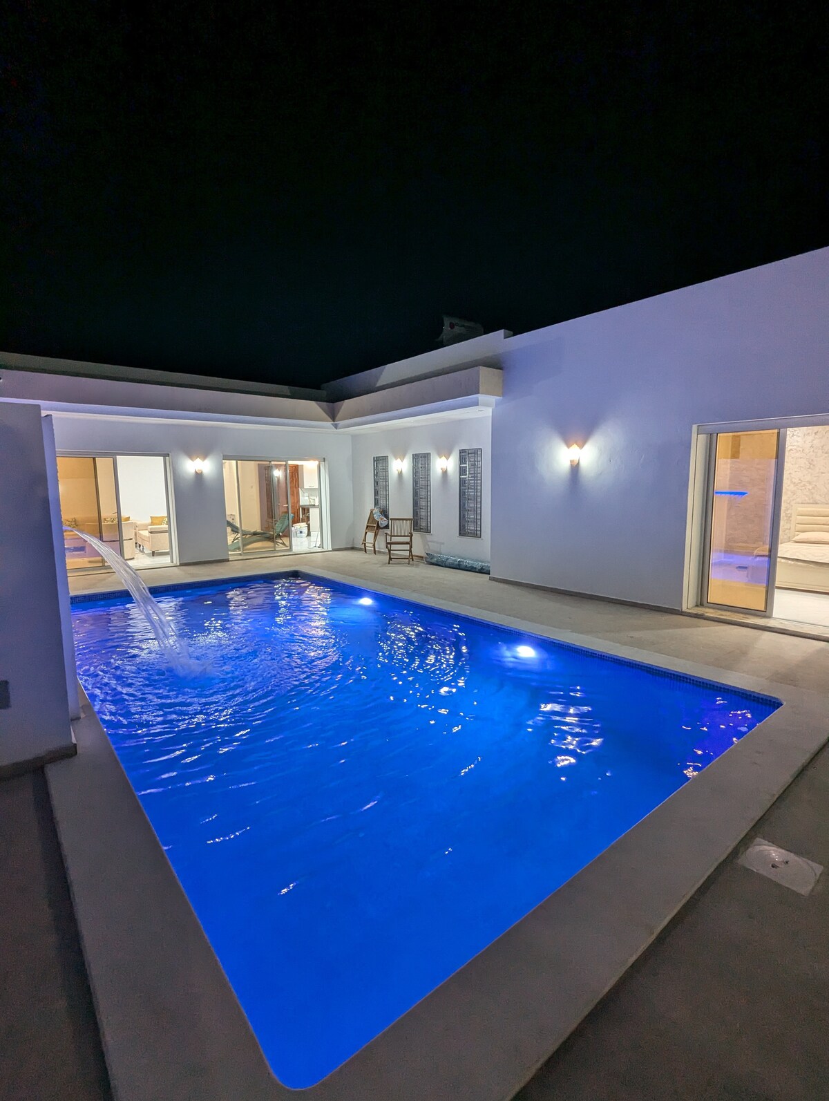 Villa Acqua : Vue Mer 180° – Été comme Hiver Vivez une expérience unique en front de mer à Nabeul. Avec ses 7 chambres (chacune avec sa salle d’eau), notre villa est parfaite pour les familles et les groupes. Confort 365j/an : Été : Accès direct plage & clim intégrale. Hiver : Ambiance cosy grâce au chauffage central. Connectivité : Wi-Fi & chaînes internationales. Profitez de l'horizon à perte de vue avec tout le confort moderne. La Villa Acqua n'attend que vous !