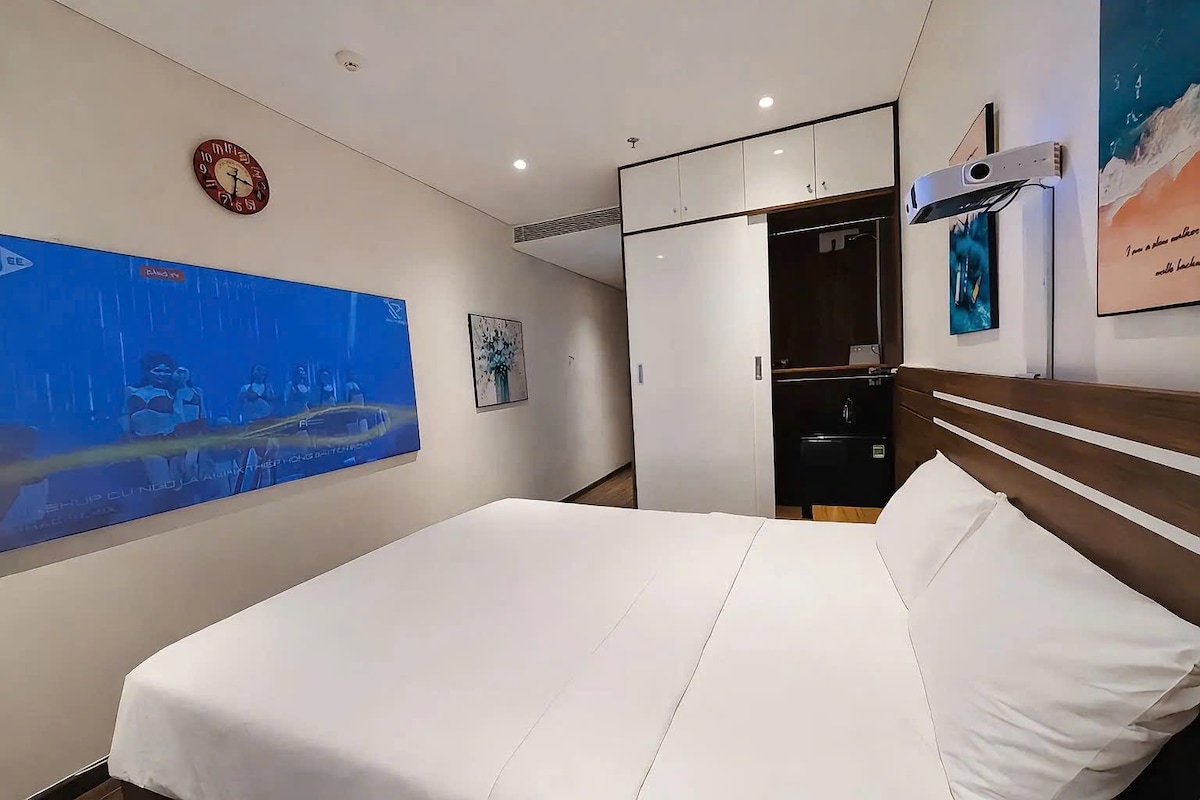 Studio 22m² với giường king, nhà vệ sinh sạch sẽ trong phòng và ban công hướng biển và thành phố thoáng mát. Khách có thể sử dụng hồ bơi vô cực, gym, spa, nhà hàng (có phụ phí).