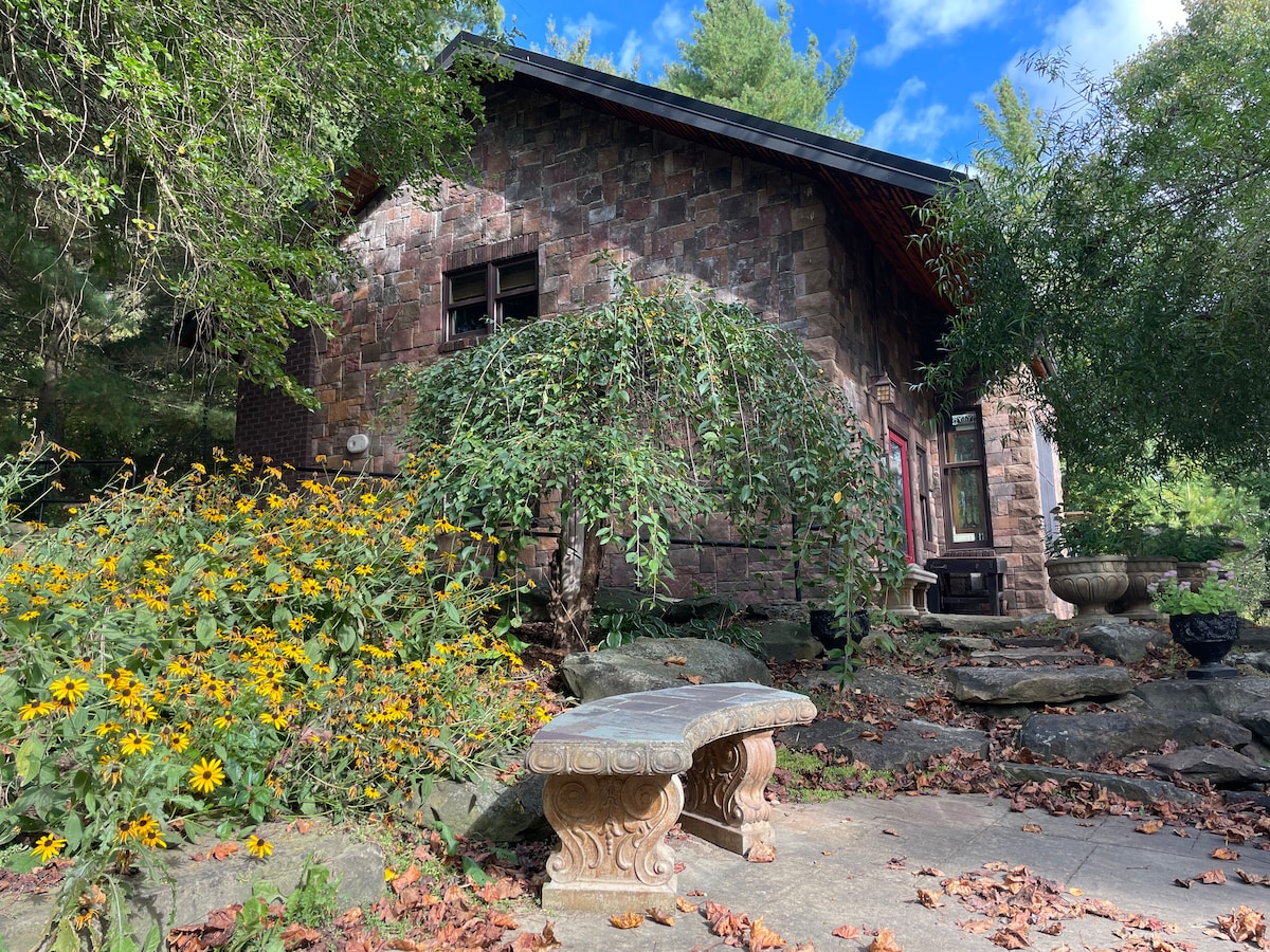 Rút lui về Fresno Escape! Cabin riêng có bồn tắm nước nóng quanh năm, hoàn hảo để thư giãn. Ẩn mình giữa những cây thông và đá ở trung tâm đất nước Amish, nơi thỉnh thoảng có những chú ngựa và xe đẩy làm tăng thêm sự quyến rũ. Với phong cách như một kho đường sắt, ngôi nhà được trang bị nội thất nghệ thuật trưng bày các tác phẩm đá phức tạp, ngói và kính màu tùy chỉnh. Bếp bao gồm các thiết bị và dụng cụ nấu ăn, với khu vực ngoài trời có bếp nướng dùng khí propan. Củi miễn phí được cung cấp cho lò sưởi.