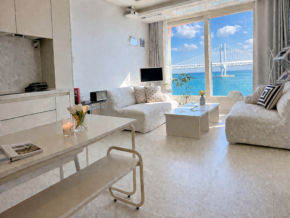 1 Chỗ ở hợp pháp • Phòng khách rộng rãi, tầm nhìn ra cầu Gwangang • (2 phòng ngủ + phòng khách) • Bãi đỗ xe miễn phí • Lưu trữ hành lý • 3 giường • 4 phút đi bộ ra biển