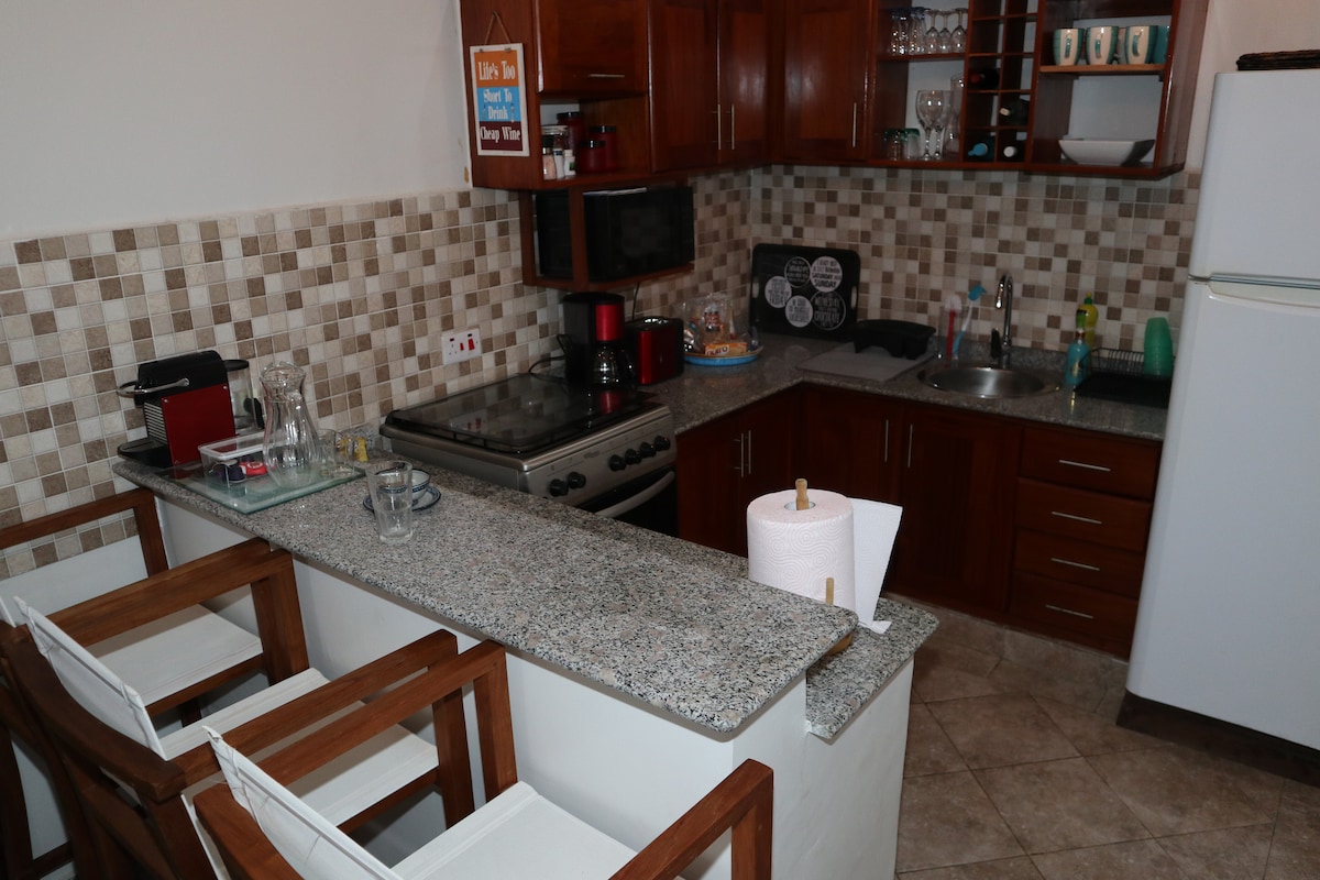 ĐÓN TẠI SÂN BAY MIỄN PHÍ cho thời gian ở từ 5 đêm trở lên! Tận hưởng thời gian lưu trú của bạn trong căn hộ sang trọng, đầy đủ tiện nghi của chúng tôi nằm trong một cộng đồng có cổng an ninh Hoàn hảo cho kỳ nghỉ tuần trăng mật, kỳ nghỉ hoặc làm việc từ xa, với tầm nhìn ra đại dương, Wifi tốc độ cao và TV thông minh Có giường queen với topper bọt nhớ, sofa giường và bếp đầy đủ tiện nghi. Bao gồm máy giặt và máy sấy riêng kết hợp và chỉ cách sân bay 15 phút. Tiện nghi tại chỗ ở - Nhà hàng - Siêu thị - Bể bơi - Máy phát điện