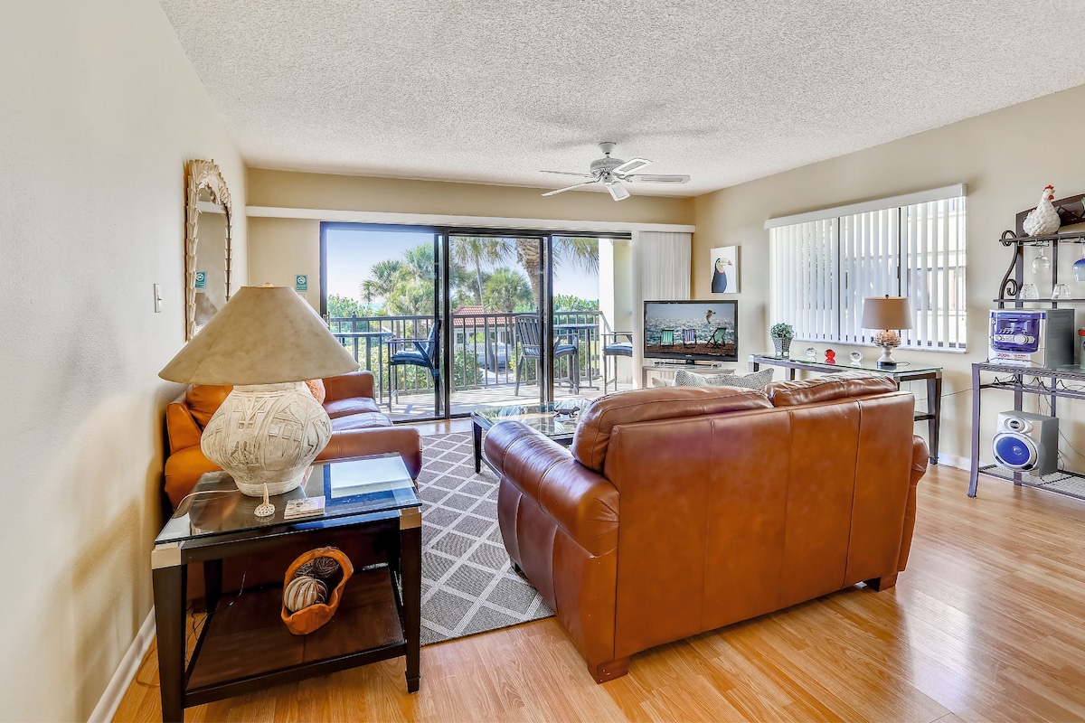 This beautiful condo was remodeled in 2024! Steps from the beach! NEW appliances, NEW air conditioning, NEW paint, NEW flooring & countertops, NEW ceiling fans & light fixtures, NEW furniture! Queen Nectar bed, Smart TV Streaming w/cable channels too, Wi-Fi, beach chairs & beach towels, Keurig style coffee maker, pots, pans, silverware, toaster, bakeware, linens, towels, and then some!
