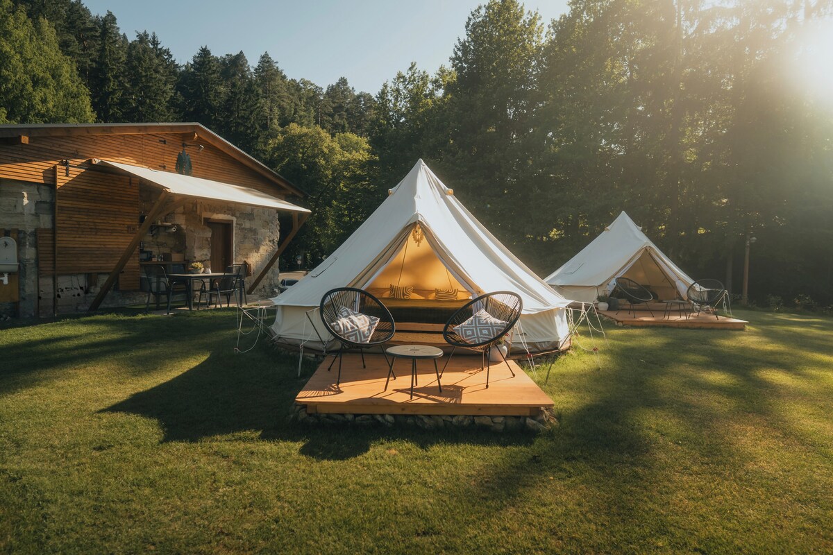 A cozy glamping tent by the stream, just 30 minutes from Prague. 🍁 Autumn here smells of wood, herbal tea with honey and peaceful forest air. The tent is fully insulated, with a heated bed, warm lighting and a magical atmosphere that slows down time. Perfect for couples or solo travelers looking for a romantic nature stay with hotel-like comfort. 🌿 Pet-friendly & designed for slow living. 🐾 Pet-friendly | 🔥 Heated tent | 💫 Telescope | hot tub by stream 🛁