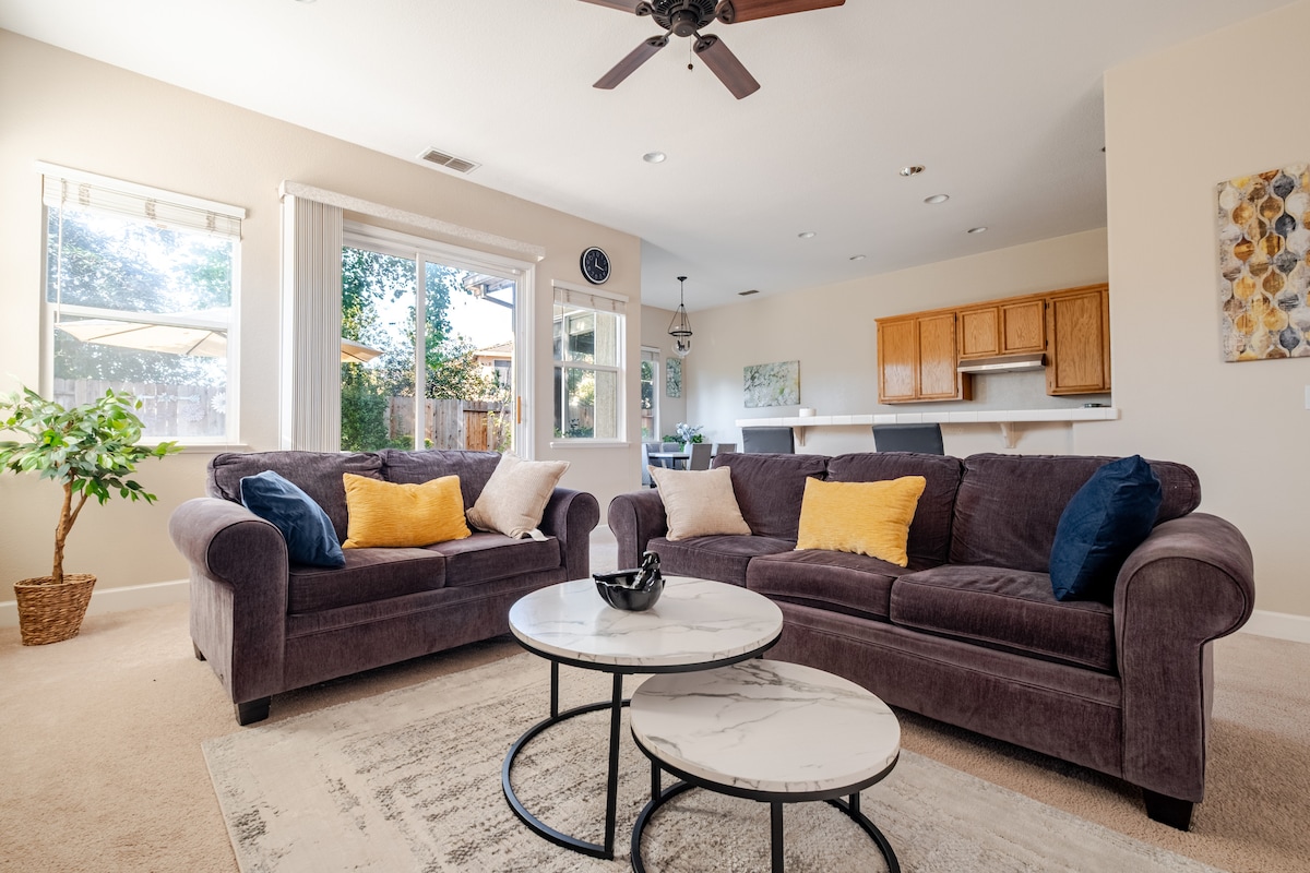 Come, stay and relax with your loved ones at this modern farmhouse in the heart of California Wine Country. We are just minutes to Napa, and within a short drive to San Francisco and Sacramento. We have home theater with 65" QLED TV and surrounded sound system, power reclining seats for best comfort while enjoying movies, fully equipped kitchen, stocked fridge with clean drinking water, patio seating area with fire pit tucked under fruit trees and vine. Our place is kid and family friendly.