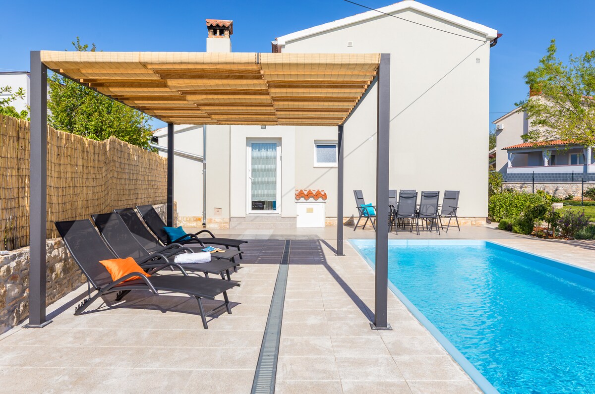 Dots n' Stripes Villa with heated pool (extra 30.- per day) This beautiful villa is located 2 km from the center of Fažana and 5 km from the center of Pula, just 500 m from the sea and the beach. The villa offers private use of a 620 m² enclosed plot with a beautifully landscaped garden and a pool (9x4 m, 140 cm deep, with internal steps), an outdoor shower, and sun loungers. Enjoy the spacious 40 m² terrace equipped with outdoor seating and a barbecue. Children can have fun at the playground.