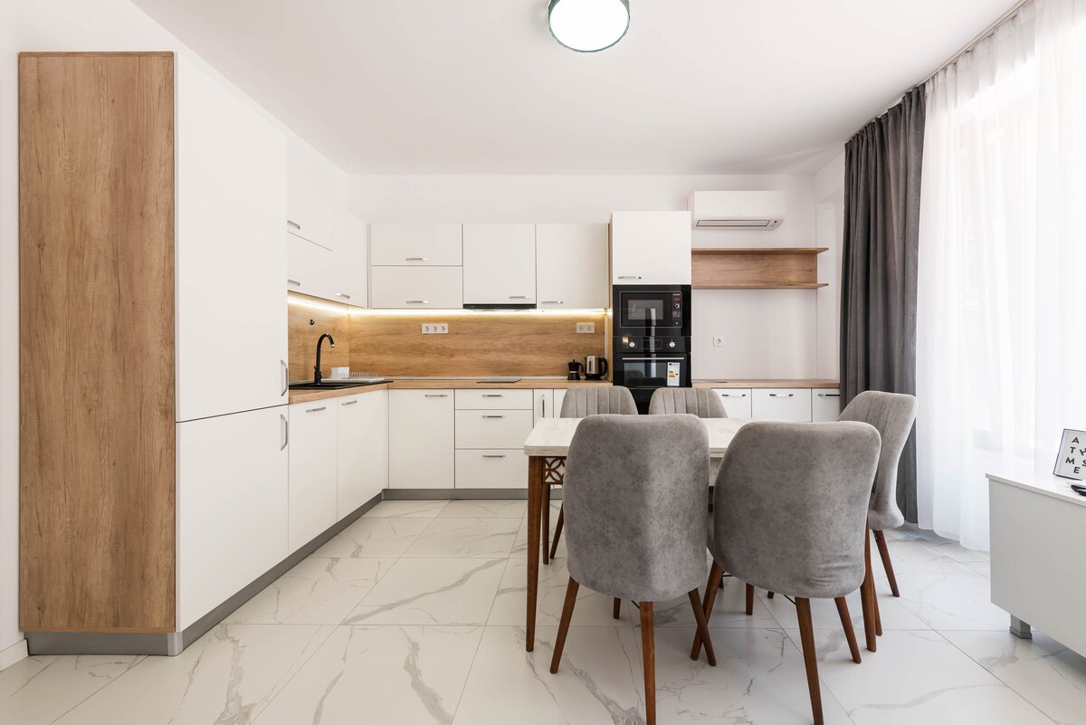 Chào mừng bạn đến với căn hộ hai phòng đầy phong cách và ấm cúng của chúng tôi, nằm trong một tòa nhà sang trọng, mới được xây dựng, nằm ở một trong những khu vực được ưa chuộng nhất của thành phố. Varna. Tận hưởng nội thất hiện đại, tiện nghi được lựa chọn cẩn thận và tầm nhìn tuyệt vời ra biển – mọi thứ bạn cần cho một kỳ nghỉ thoải mái và trọn vẹn. Nó nằm cách Sea Garden, Dolphinarium, Sở thú và bãi biển vài mét. Khu vực giao tiếp với các cửa hàng, phòng khám, nhà hàng, điểm dừng xe buýt và đến trung tâm thành phố.