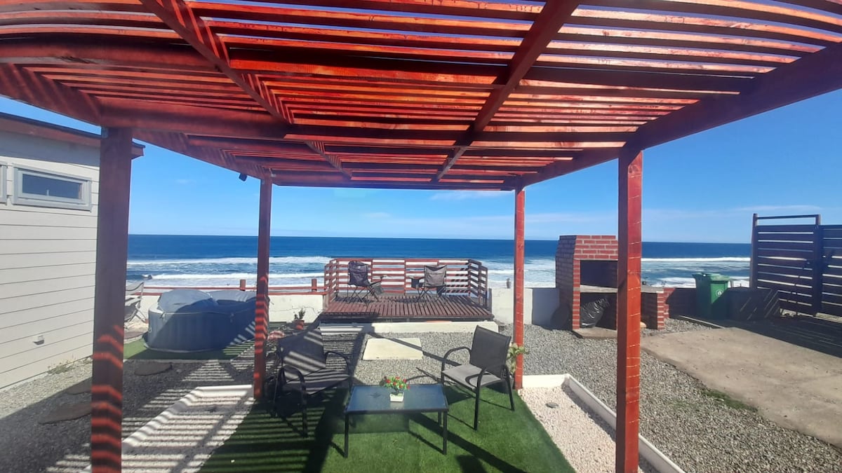 Casa a 30 min de Valdivia frente al mar 3D y 2B para 6 personas. Consulta la posibilidad de cabaña adicional para aumentar la cantidad de pasajeros. Jacuzzi y vista al mar; 2 habitaciones pequeñas con literas; ; terraza y jardín picnic, frente a playa Pta Loncoyen pero sin acceso directo, cerca de las mejores playas, Parque Oncol, feria costumbrista restaurantes de la zona y mercado local. Internet Starlink, Smart tv, aire acondicionado. cafetera, parrilla, etc.