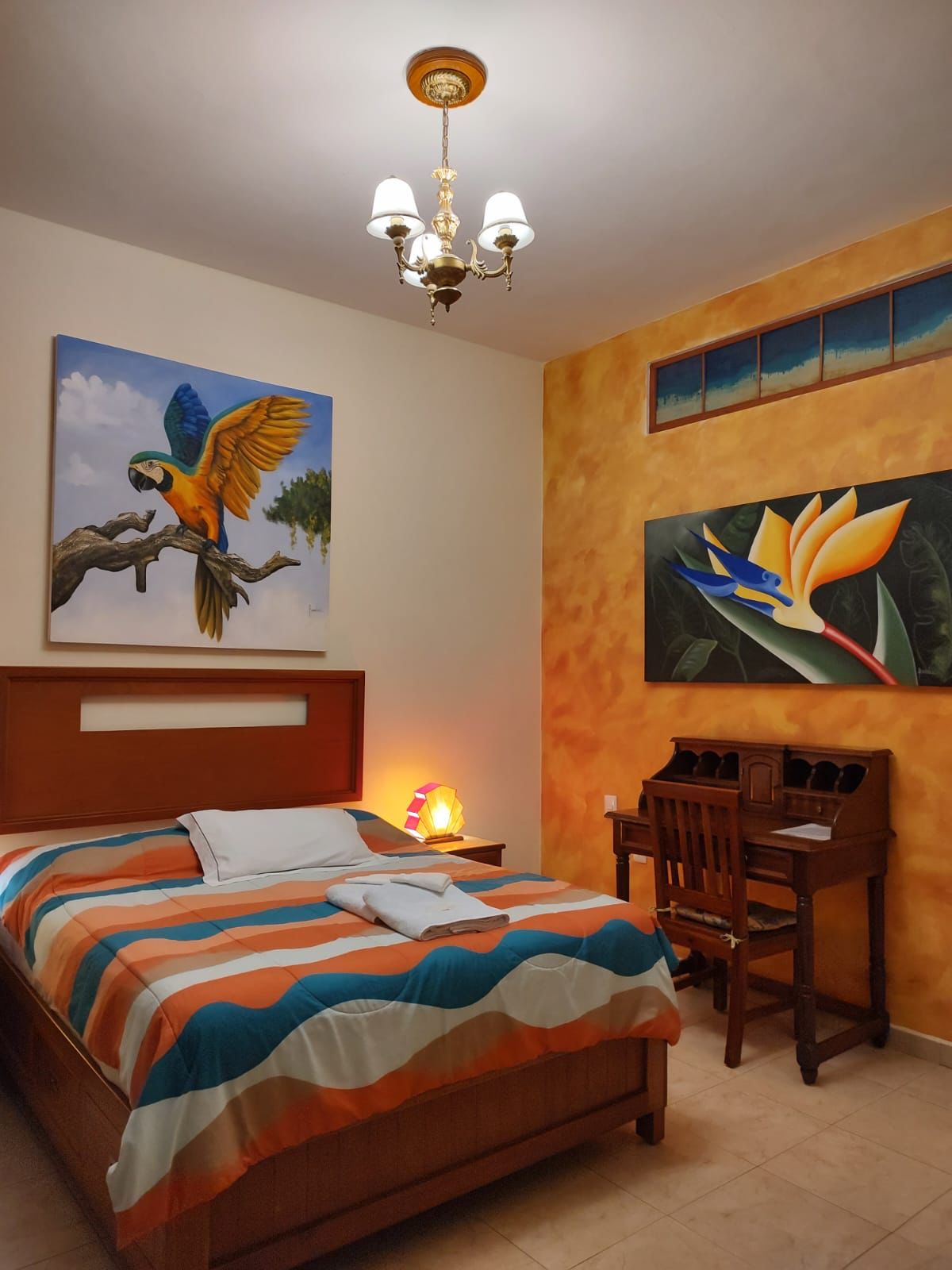 Disfruta un lugar alejado de la multitud y rodeado de un jardín, es uno de los pocos hospedajes con alberca Las recámaras cuentan con muebles y arte original. Relájate desde tu terraza y planea las multiples actividades que se pueden realizar como visitar las históricas calles de Sisal, el convento y la calzada de los frailes que aloja varios restaurantes y bares. *Pregunta por nuestras otras habitaciones en la propiedad y su disponibilidad*