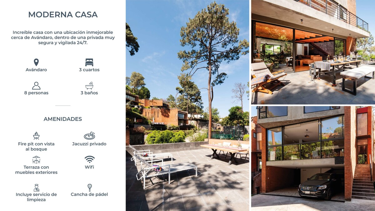 Ngôi nhà nhìn ra hồ và những ngọn núi, ở giữa rừng, với khu vườn riêng rộng 5.000 m2, hồ bơi riêng với hệ thống sưởi và phòng tập thể dục riêng; nằm trong một phân khu với an ninh 24 giờ. Thiết kế kiến trúc không đồng đều với trần nhà cao đến hai vùng nước, dầm và cột gỗ, ván lợp đỏ, bùn và gỗ. Trang trí với các yếu tố truyền thống của một ngôi nhà Mexico đương đại. Được chiếu sáng đặc biệt nhìn ra rừng và vườn từ bất kỳ cửa sổ nào.