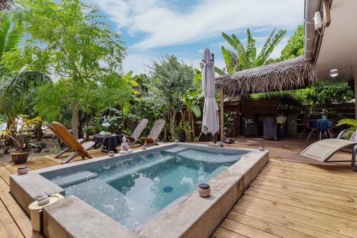 Chào mừng bạn đến với kỳ nghỉ yên bình ở thiên đường! Biệt thự rộng 100 m² này với sân thượng riêng và bể sục jacuzzi là nơi hoàn hảo để thư giãn, được bao quanh bởi cây xanh tươi tốt và nhìn ra đầm phá. Mỗi buổi tối, hãy tận hưởng cảnh hoàng hôn ngoạn mục trong khung cảnh thanh bình và kỳ lạ. Lấy cảm hứng từ kiến trúc tân Polynesia, biệt thự pha trộn nét quyến rũ địa phương với sự thoải mái hiện đại để mang đến cho bạn một kỳ nghỉ khó quên.