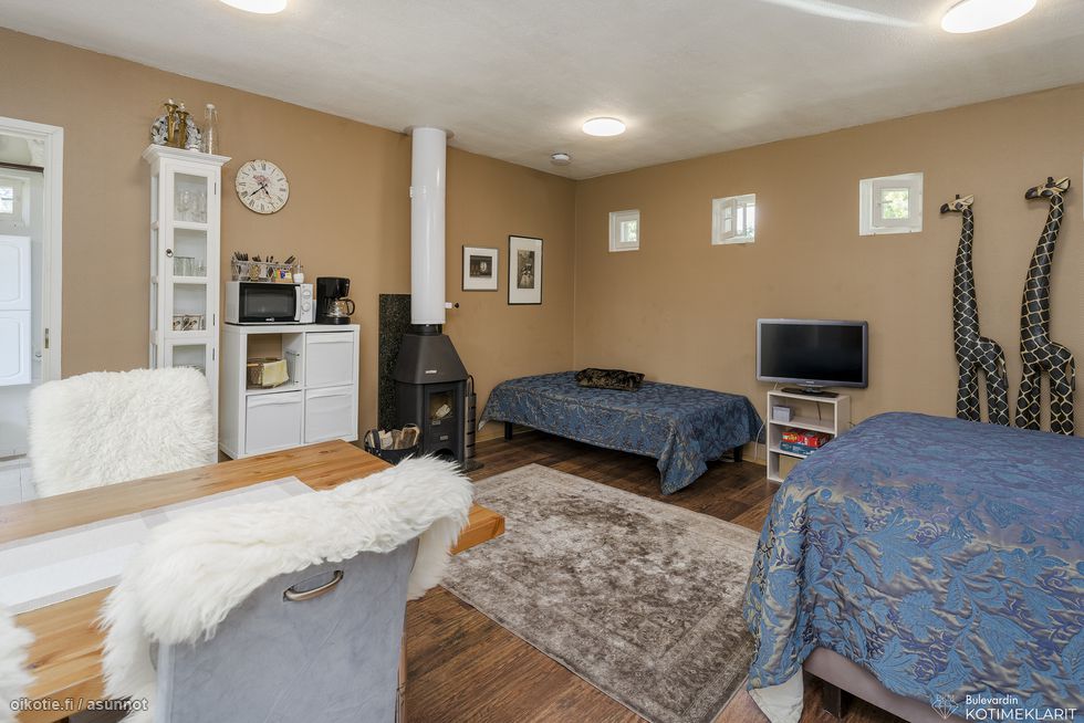 Small, single-room cottage/studio (ca 30 m2). Spacious for 2, can fit up to 4. Basic equipment. Kitchenette - fridge, 2 hotplates, microwave, coffee maker, electric kettle. Good bathroom with shower (more info below). Room and alcove with queen sized bed (120 cm) and bunk bed - no door between the alcove and room. Sofa bed in the room, spare bed available. 5 kms away from the Helsinki Airport (access by bus/train or taxi, taxi about 16-20€), easy access to Helsinki and Tikkurila train station.