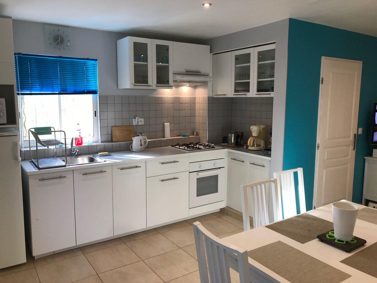 T2, 55m2. Phòng khách 30m2 bếp được trang bị, 4 bếp, lò nướng, máy pha cà phê lọc và Senseo, tủ lạnh/tủ đông, lò vi sóng. Trà, cà phê miễn phí Phòng mát mẻ vào mùa hè, 20 m2: 1 giường 140 cm, 1 giường 110 cm. Nhà vệ sinh riêng. Phòng tắm: buồng tắm đứng, bồn rửa. Hệ thống sưởi điện (2 phòng khách, 1 phòng ngủ, 1 phòng tắm) Miễn phí nước giặt (ở từ 4 đêm). Cho thuê xe đạp (từ 2 đêm, không phải vào ngày khởi hành hoặc đến): 1 xe điện có mũ bảo hiểm, cả ngày.