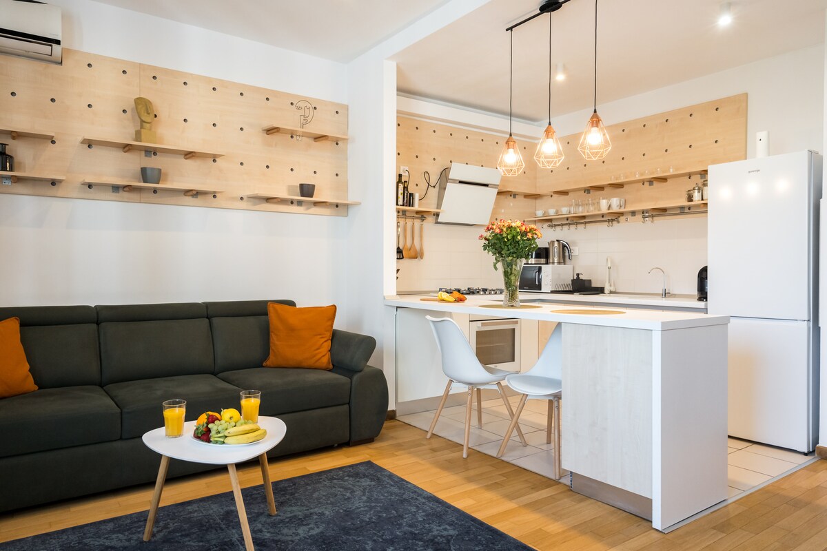 Keep it simple at this peaceful and centrally-located place. This beautiful apartment in located in a newly built super central luxury complex, with a private parking space and a 24/7 doorman. Located in the heart of Bucharest and easily accessible by public transport. This bright apartment is newly refurbished in 2022 with high standard materials and has all possible amenities available for a perfect stay.