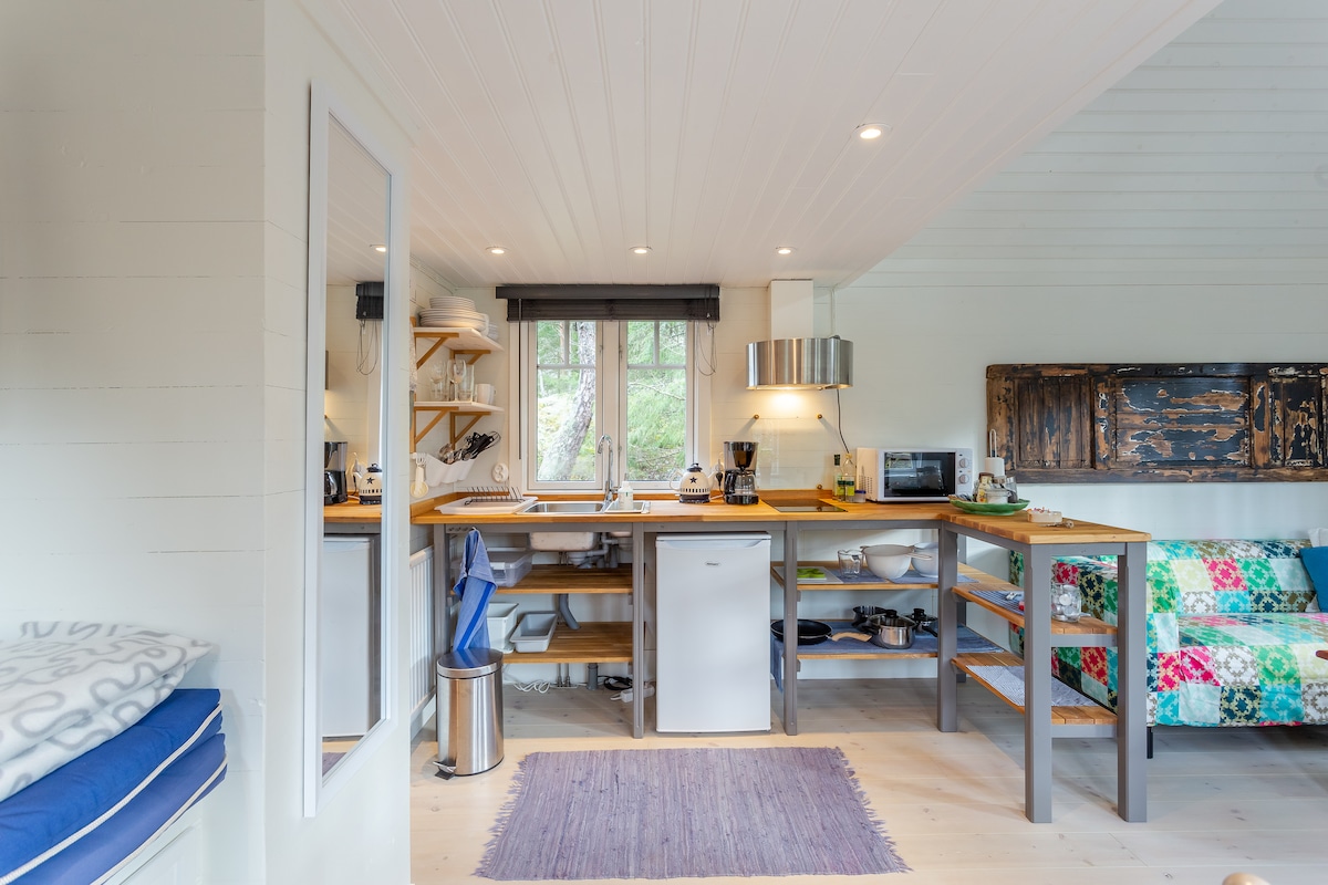 The sea virtually at your feet. Tastefully decorated cottage with double bed and extra bed. Unique secluded location on its own peninsula at the shore, panoramic views and private jetty for sunbathing, swimming and fishing. Fully equipped kitchen. Shower and TC. Furniture and bbq on the jetty. Your stay at the Seaside cottage will be without carbon footprints and in line with a sustainable way of living