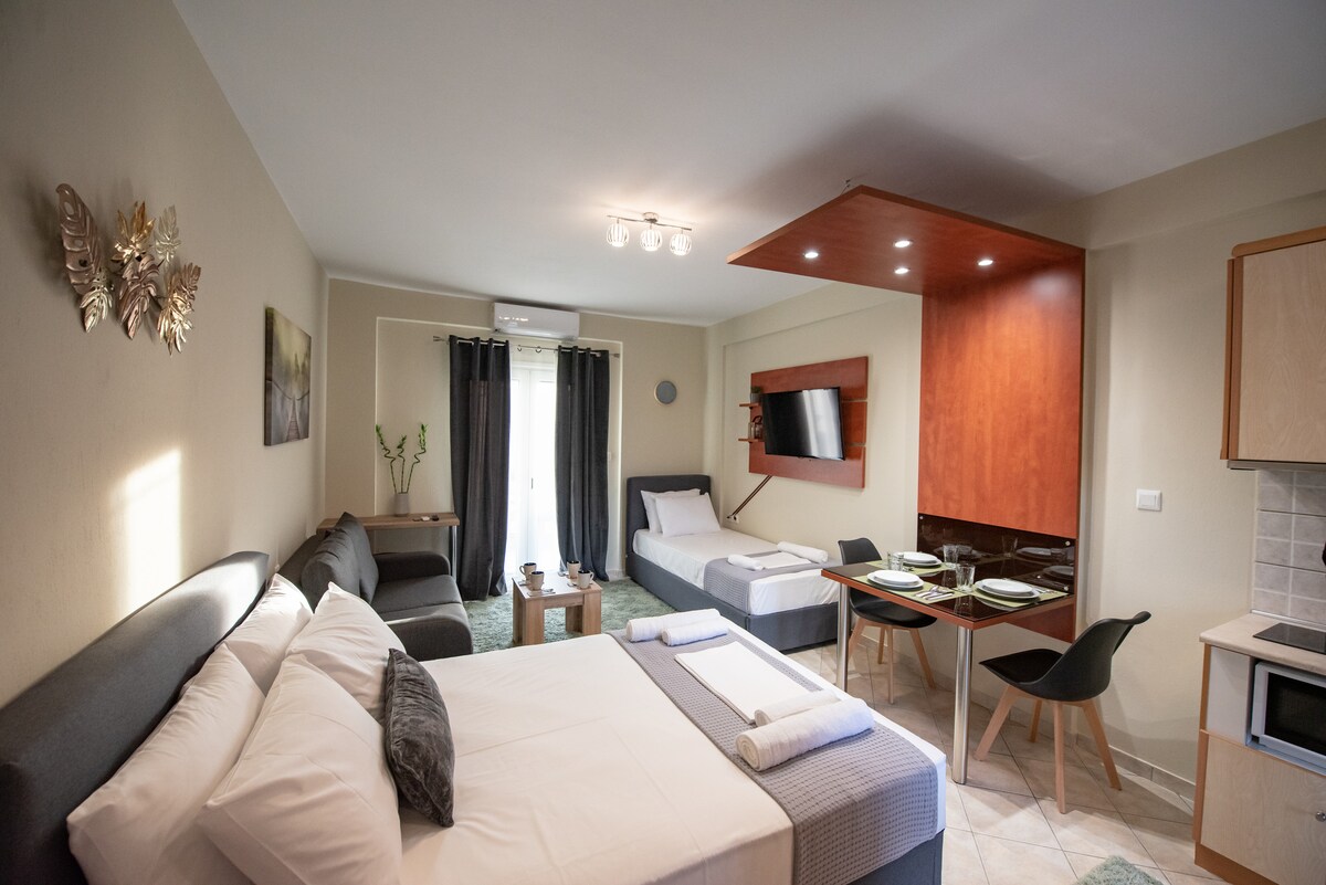Καλαίσθητο στούντιο(16,65 τετραγωνικων) με μεγάλη βεράντα ,πολύ κοντά στο κέντρο της πόλης.Θέα σε πλατεία ,δίπλα απο τη στάση λεωφορείου ,super market και ξυλόφουρνο . 10 λεπτά με τα πόδια το κέντρο της πόλης και 15 λεπτά επίσης περπατώντας ,το ιστορικό κέντρο ! 5 λεπτά με τα πόδια η λίμνη των Ιωαννίνων!Πλήρως εξοπλισμένη κουζίνα,καφετιέρα και dvd player με ταινίες για σινεφίλ