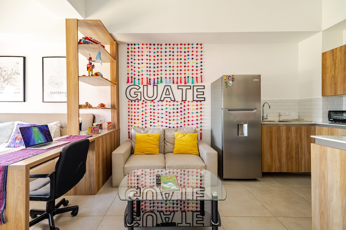 Căn hộ đẹp và ấm cúng với tầm nhìn ngoạn mục từ ban công đến núi lửa Agua và Pacaya. Cách Sân bay 10 phút. Nó có giường cỡ Queen và giường sofa, nhà bếp được trang bị, điều hòa, TV thông minh, phòng tắm riêng và bãi đỗ xe miễn phí. Tòa nhà có nhà hàng, cửa hàng tiện lợi, an ninh, lễ tân 24 giờ, giặt ủi và sân thượng chung. Nằm trước Plaza Berlin, một trong những quảng trường đẹp nhất ở Ave. las Americas, lý tưởng cho một khoảnh khắc ngoài trời. .