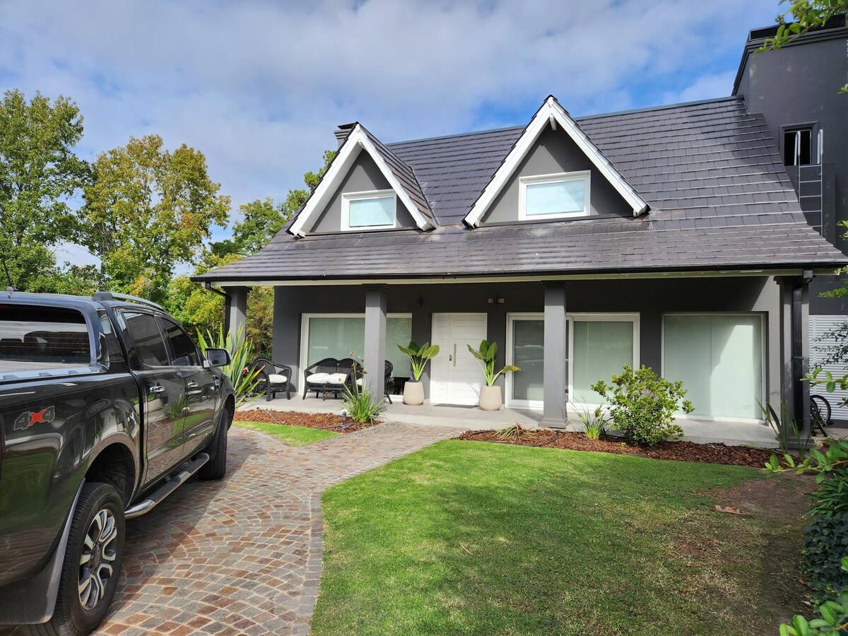 Casa estilo boho en Haras del Sol, ideal familias y amigos. 4 dormitorios, 3 baños uno ducha escosesa y otro con jacuzzi. Toilette, cocina y living integrados, escritorio, galería con parrilla y gran parque. Pileta climatizada con hidromasaje. WiFi, Smart TVs, A/A y calefacción en todos los ambientes. Totalmente equipada. Barrio privado con seguridad 24 hs, canchas, gym, restaurante, piscina, plaza y más. Disfrutá confort, naturaleza y tranquilidad en Pilar. Estadía mínima 20 noches