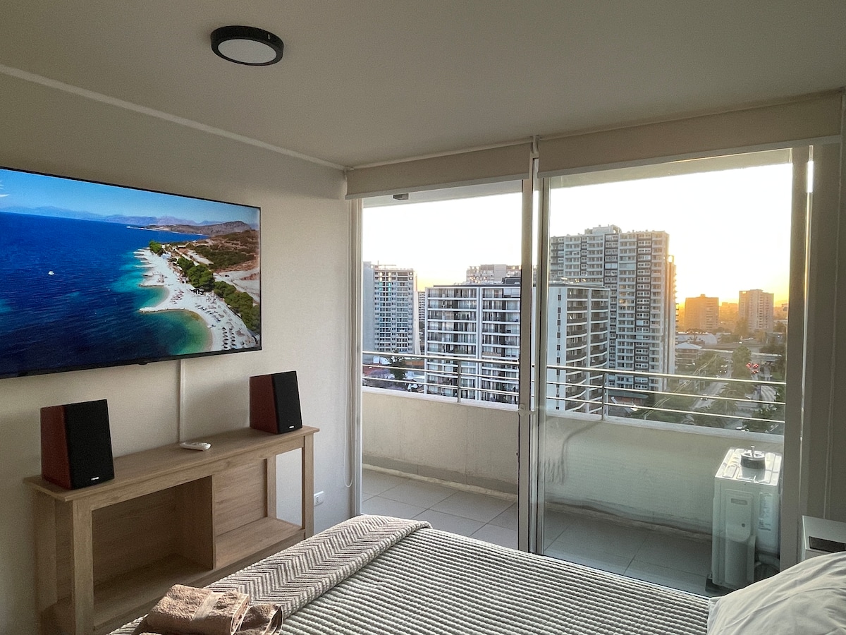Departamento 2 habitaciones, 2 baños y estacionamiento con vista a la Cordillera. Departamento completamente equipado. Hab Uno: 1 cama 2 plazas, baño, TV y Aire/A Hab Dos: 1 cama 1.5 plaza, 1 cama nido, baño y closet Living con TV 55", sillón Comedor 4 puestos Estacionamiento 1 puesto Cocina completamente equipada Piscina y Gimnasio Cercano a Est/Metro Estadio Nacional, C.C Portal Ñuñoa y Universidad de Chile. El barrio es muy tranquilo, lindo y seguro. Conserjería 24/7
