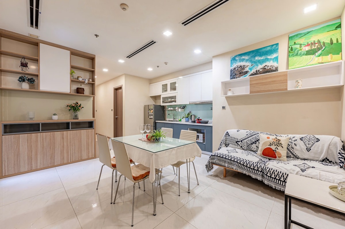 +Căn hộ trong tòa nhà Landmark2, cạnh Landmark81. +Đây là Officetel (Văn phòng+Khách sạn) Căn hộ cho phép thực hiện Airbnb. +Phòng ngủ có nệm Luxury Memory-Foam, King Size-1m8x2m, hoàn hảo và thoải mái, tốt cho vấn đề đau lưng. +Có máy giặt & máy sấy +Vệ sinh, sạch sẽ là ưu tiên hàng đầu của tôi. Khăn trải giường và khăn tắm luôn được gia hạn khi đến +Có dịch vụ vệ sinh miễn phí cho thời gian lưu trú dài hạn