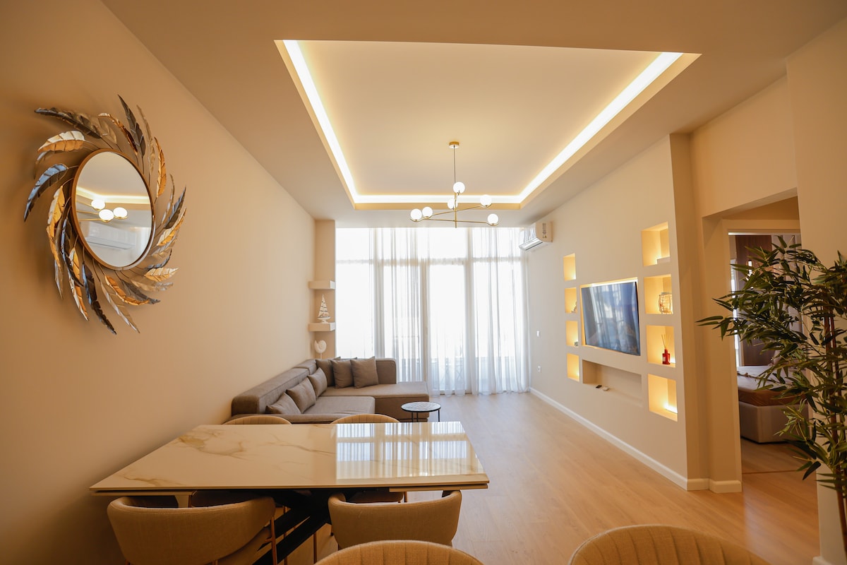 Ngồi lại và vui chơi với gia đình và bạn bè của bạn trong căn hộ đầy phong cách này. Được trang bị mới theo thông số kỹ thuật cao, nằm độc đáo trên một ngọn đồi xinh đẹp của Uji Ftohte ở Lungomare, căn hộ cách 10 phút đi bộ đến một số bãi biển đẹp nhất ở Vlora. Bao gồm khu vực sinh hoạt và ăn uống, nhà bếp mở đầy đủ tiện nghi, 2 phòng ngủ, 2 phòng tắm và 2 ban công để tận hưởng tầm nhìn ra biển vô song, hoàng hôn tuyệt đẹp và Vịnh Vlora. Chỗ đỗ xe miễn phí trong khuôn viên. Bãi biển và tất cả các tiện nghi đều cách một quãng đi bộ.