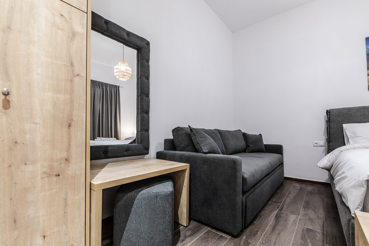 Kiến trúc gác xép độc đáo với cầu thang đôi dẫn đến hai tầng lửng đối diện. Ở tầng một có một phòng khách lớn và một phòng BA hiện đại. Nó có hai điều hòa không khí, tủ lạnh, lò vi sóng, lò nướng điện, máy nướng bánh mì, máy pha cà phê và ghế sofa góc lớn cũng như bàn tu viện với ghế dài. Ngoài ra còn có ban công 9 mét. Và chỗ đỗ xe miễn phí. Không gian đặc biệt này gần mọi thứ . Ιt cũng có thể được kết hợp với 2 tầng lửng khác trong cùng một tòa nhà cho nhiều khách hơn.