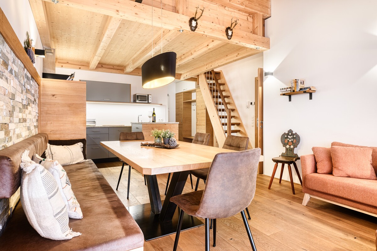 Cozy attic apartment with 95m² for families and friends with alpine flair and three comfortable bedrooms, all with balcony access. The living and dining area invites you to relax and the kitchen leaves nothing to be desired. 3 double bedrooms with high-quality box-spring beds, all with balcony access; one with additional children's bunk bed on a gallery 2 bathrooms with shower and WC High ceilings throughout with cozy wooden beams Direct access via elevator to the indoor pool and sauna area