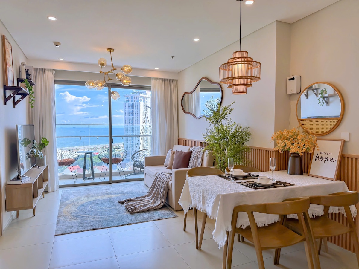Minimalist, fully furnished 1BR apartment on the 15th floor with spectacular sea views. Ideal for couples or families with one child under 5. Perfectly located beside the Back beach (Thuỳ Vân beach). Estimated walking times to nearby amenities: - 2 minutes to reach the beach across the street - 5 minutes to the nearest 24/7 convenience store (GS25) - 8 minutes to the nearest supermarket (Lotte Mart) Fast elevators. Free Netflix. We also have one motorbike available for rent.