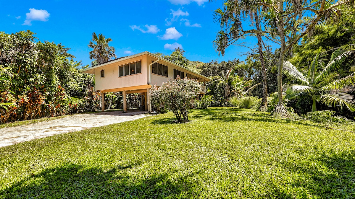 TVNC#1146 - Gated entrance leads you through a 6 foot lava rock wall. The rear, ground level, traditional Hawaiian style house is privately tucked away behind the housekeepers front house. Backyard Lanai commands your attention onto conservation Lands with massive mountain and waterfall views . Cedar wood lined interior walls and local artwork adorn the 1600 square foot house. Walk 1/3 mile to Tunnels Beach 5 minutes Kauai lifestyle Note: property located in tsunami evacuation zone.