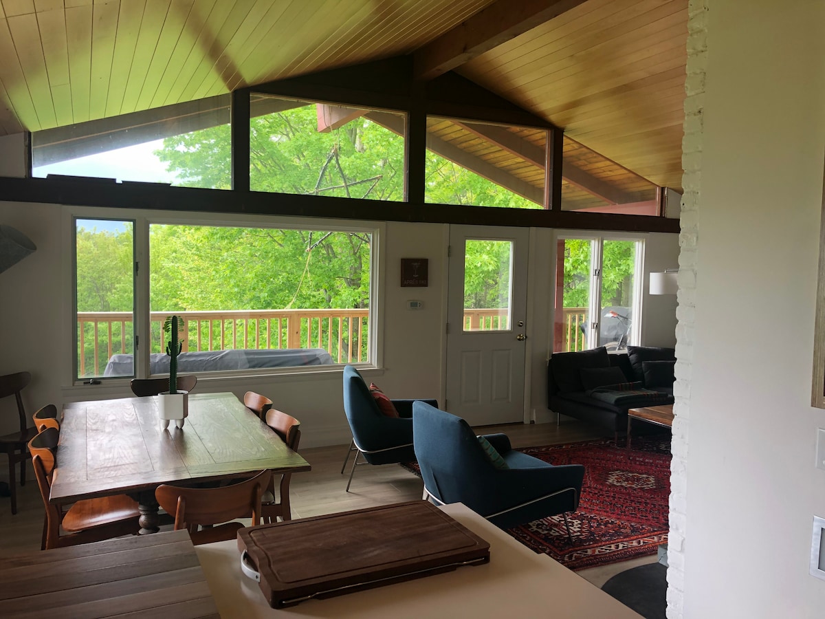 Thức dậy với khung cảnh tuyệt đẹp của Sugarbush trong "Flat Roof A-Frame" này. Bốn phòng ngủ, một tầng lửng ngủ, ba phòng tắm, hai phòng khách, một phòng ăn, một nhà bếp mới được cải tạo, một khu vực bàn làm việc có Wi-fi, hai sàn (một bếp nướng gas) và một phòng giặt ủi/phòng trò chơi cung cấp nhiều không gian cho các cuộc họp mặt gia đình. Nằm cách thị trấn 3 phút. Không thích hợp cho trẻ nhỏ/trẻ mới biết đi hoặc khách gặp vấn đề về di chuyển. Trong mùa hè, chúng tôi chỉ cho thuê từ 6 đêm trở lên với sự thay đổi vào thứ Sáu.