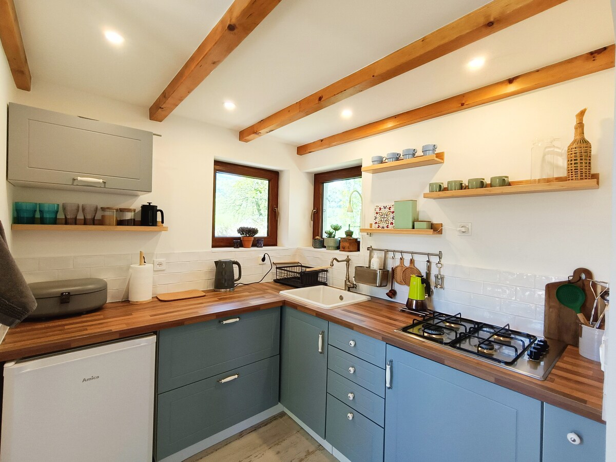 Nhà nghỉ thôn dã thân mật và ấm cúng, gần rừng và đường mòn trên núi. Nó nằm cạnh nhà của chúng tôi, trong khoảng cách thuận tiện đến nhiều điểm tham quan của Dãy núi Cú. Không có TV trong nhà nghỉ thôn dã, nhưng không có vấn đề gì với phạm vi phủ sóng internet. - Tầng: hai phòng ngủ (một đi qua), một giường đôi và hai giường đơn, và một giường sofa đơn + không gian làm việc của máy tính. -Parter: ghế sofa, bàn có ghế, nhà bếp và phòng tắm có vòi sen và máy sấy. - Đỗ xe tại chỗ ở. - Hộp thiết bị.