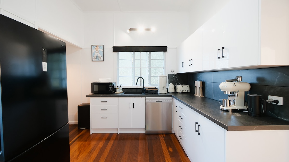 Gần các bệnh viện, trường học, TAFE, cửa hàng và Vườn bách thảo, căn hộ khép kín hoàn toàn là một bổ sung hiện đại ở tầng dưới (có lối vào riêng biệt), cho một Queenslander được phục hồi. Khu vườn nhiệt đới đáng yêu với lối đi riêng ra sân có lá cây. Cho dù là vào kỳ nghỉ, công tác hay thăm người thân, bạn sẽ được chăm sóc bởi những cư dân dài hạn với nhiều kiến thức và kết nối cộng đồng. Chỗ ở của chúng tôi phù hợp với các cặp đôi, những người phiêu lưu một mình, những người đi công tác và gia đình (có trẻ con).