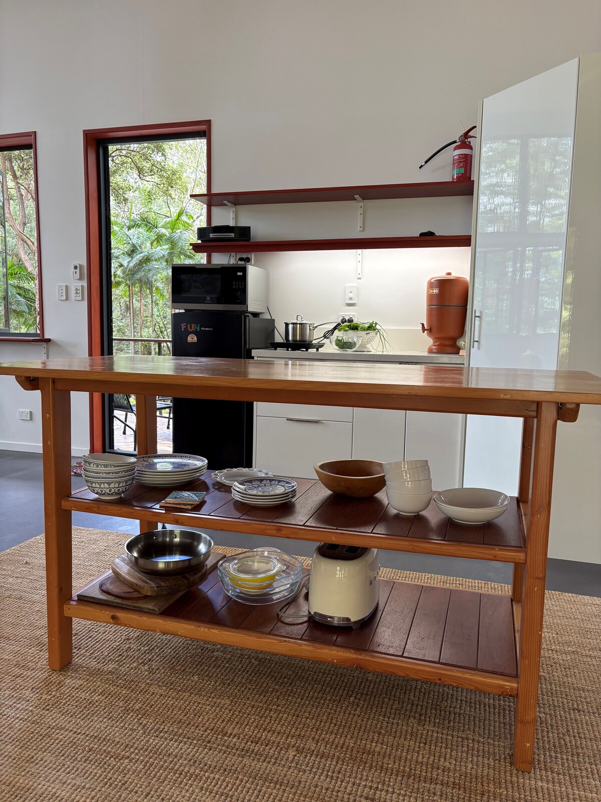 The Barn is a private space tucked away on 100 acres of rolling hills, rainforest, and macadamia orchards well away from the main house, with stunning views of the foothills of the Nightcap Range. A perfect spot to unwind, with peaceful walks to a secluded swimming hole and waterfall. You’ll share the land with wallabies, echidnas, donkeys, goats, a cow, 3 calves and our friendly green frog, Frankie. A short drive to Clunes, Federal, and Bangalow, it’s a quiet escape to rest and recharge.