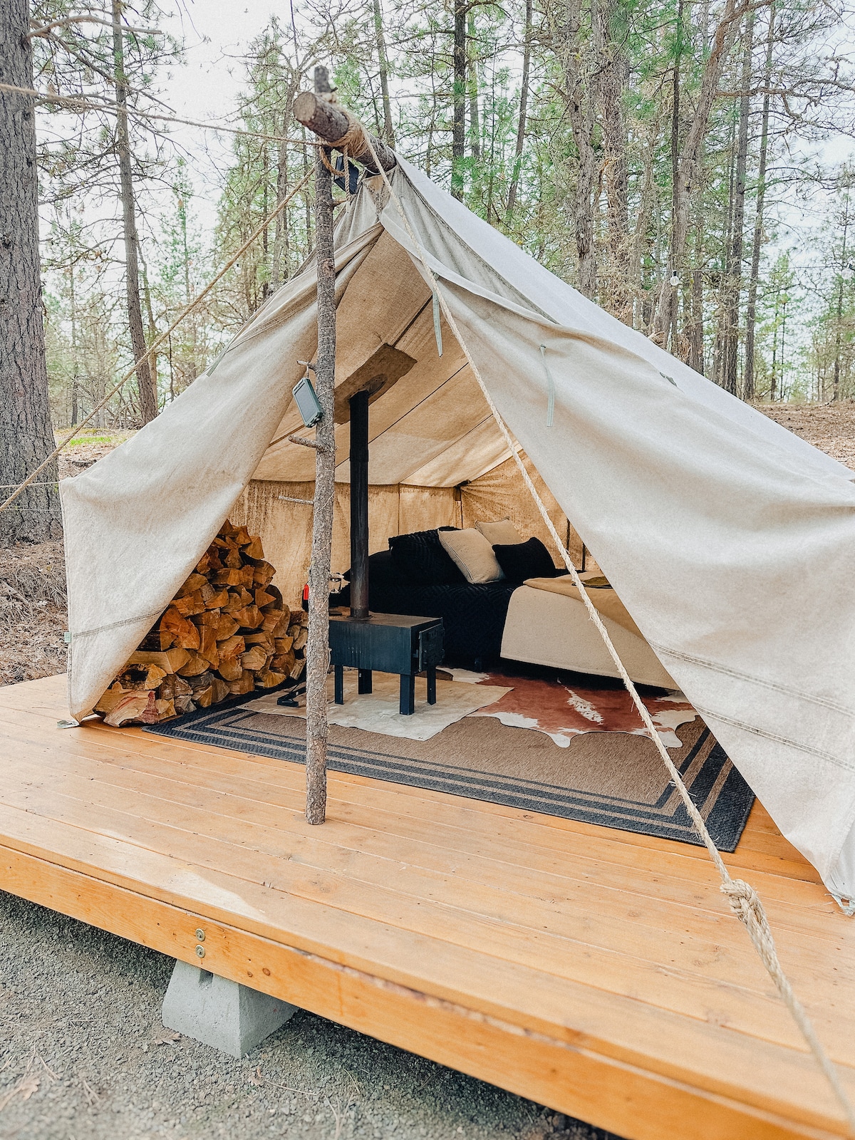 Lều GLAMPING theo chủ đề bohemian của chúng tôi nằm trên bãi cắm trại cổ kính của riêng nó. Đây là một địa điểm không có lưới điện. Không có nước sinh hoạt hoặc điện trong lều nhưng bạn sẽ không bao giờ biết điều đó. Lãng mạn được thắp sáng bằng đèn nến! Nghe tiếng mưa rơi đập vào bạt hoặc thức dậy với tiếng chim hót. Được trang bị tất cả những gì bạn cần để đóng gói túi quần áo và thực phẩm ! Chúng tôi hy vọng chúng tôi đã nghĩ đến phần còn lại !