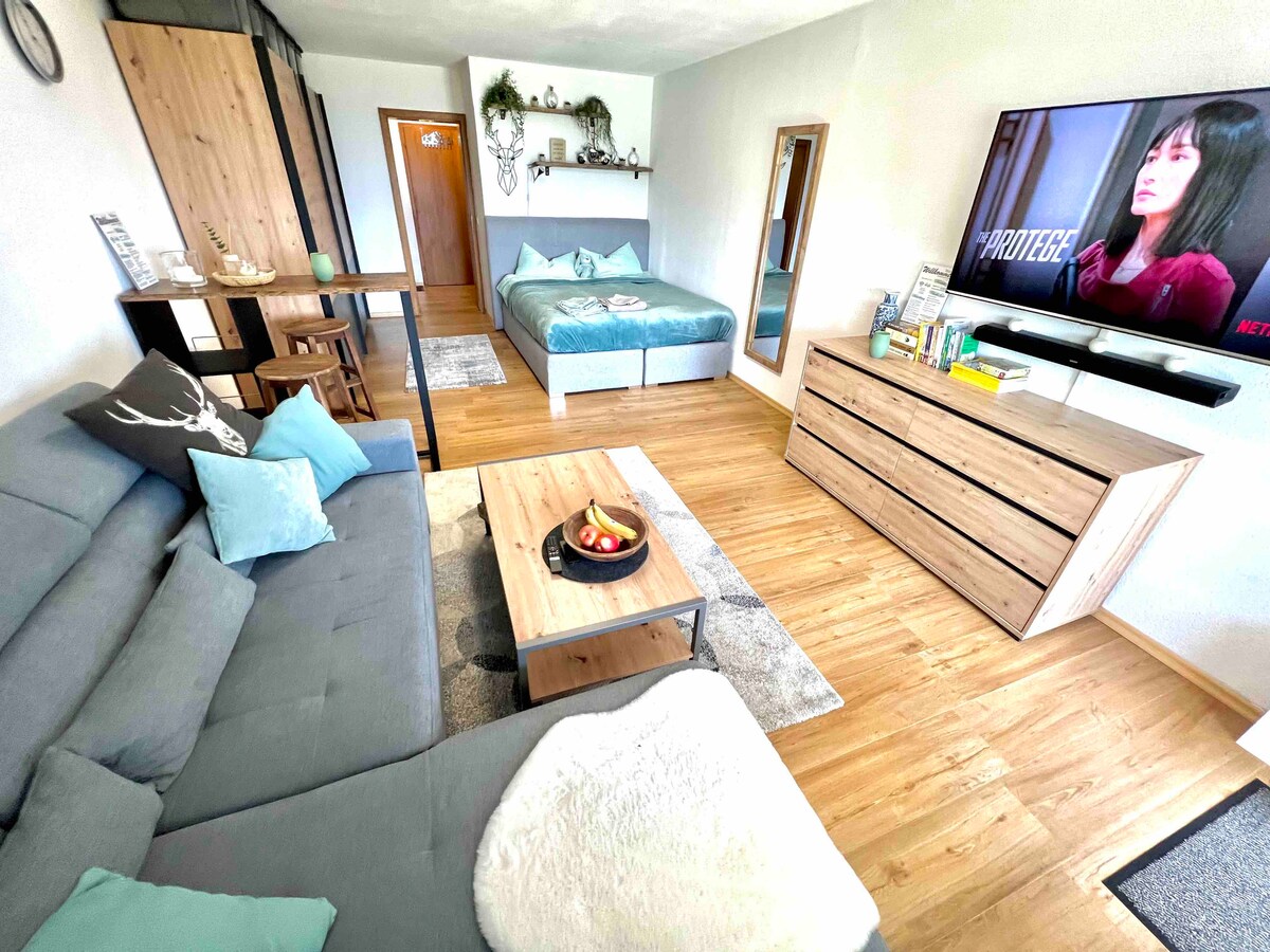 Căn hộ tràn ngập ánh sáng, được trang bị đầy đủ tiện nghi với lối vào riêng từ khu vườn nằm trong một ngôi nhà định cư trên Halblech. Diện tích 43 m2, khu vực sinh hoạt và ngủ nghỉ không được ngăn cách bởi một cánh cửa. Căn hộ phù hợp với các cặp vợ chồng hoặc gia đình có tối đa hai con. Giường đôi, 180 x 200 và giường sofa 140 x 195 cung cấp rất nhiều không gian. Bếp nhỏ được trang bị bếp từ, tủ lạnh và bồn rửa.