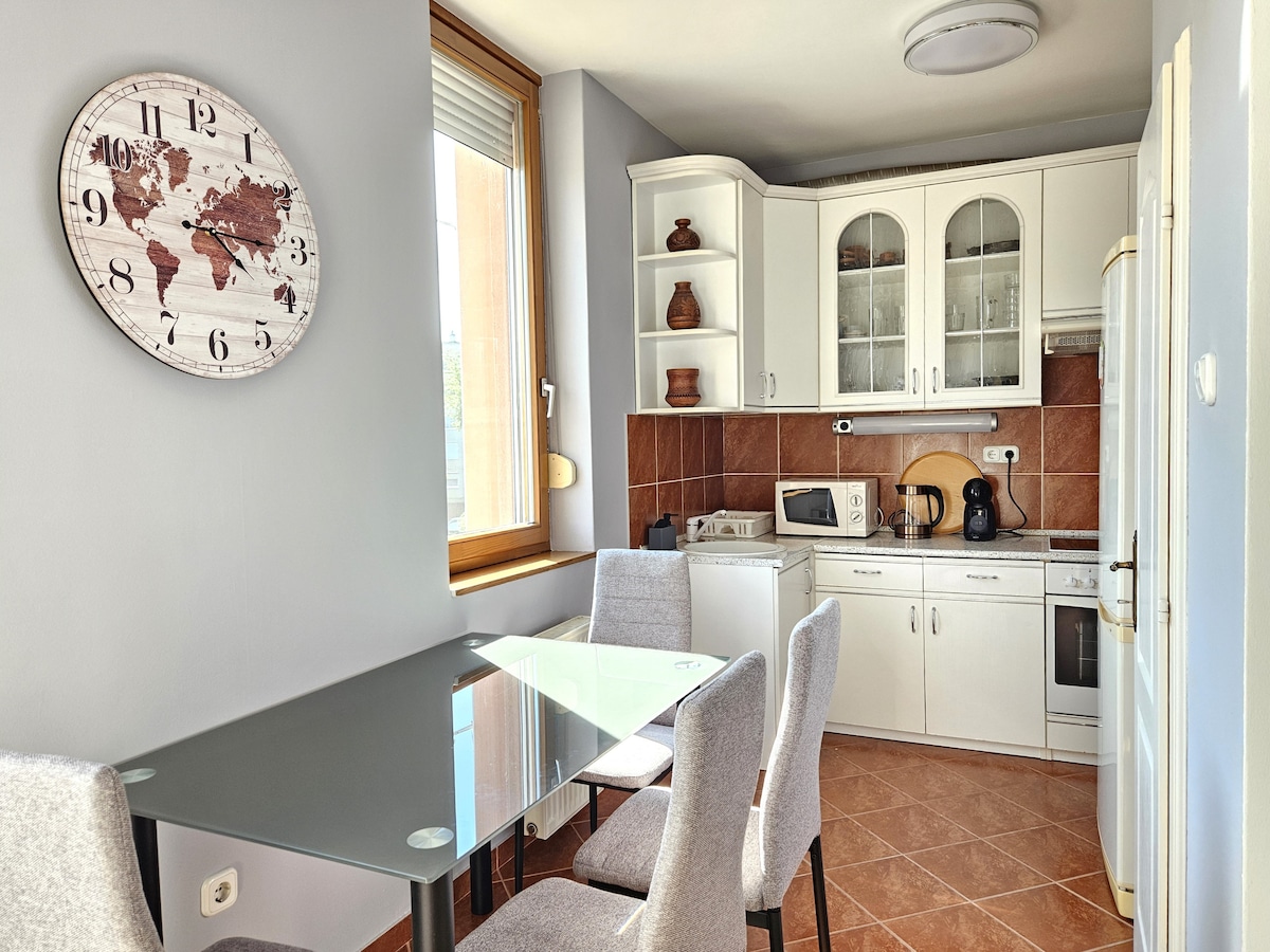 On the main square of Kaposvár, in a pedestrian street, in a monumental building with cameras We are waiting for you in our apartment with American kitchen. 20 metres from bakery, restaurant, pastry shop. Self-catering, fully equipped kitchen with morning coffee. Washing, ironing facilities , Double beds, gallery layout also serve longer rest. Everything is within walking distance fast free wifi, 141channel TV, home office option, Free air conditioning.
