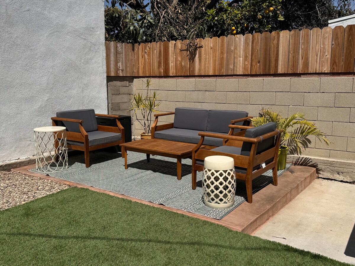 This cozy Spanish-style 1-bedroom, 1-bath home is the perfect Los Angeles getaway. Nestled in a quiet neighborhood, it offers easy access to major attractions, just 10 minutes from SoFi Stadium, Intuit Dome, The Forum, and LAX, with quick routes to downtown. You'll find a comfortable queen-sized bed waiting for you, ensuring a restful stay. The spacious backyard features patio furniture, ideal for relaxation and enjoying the California sunshine.